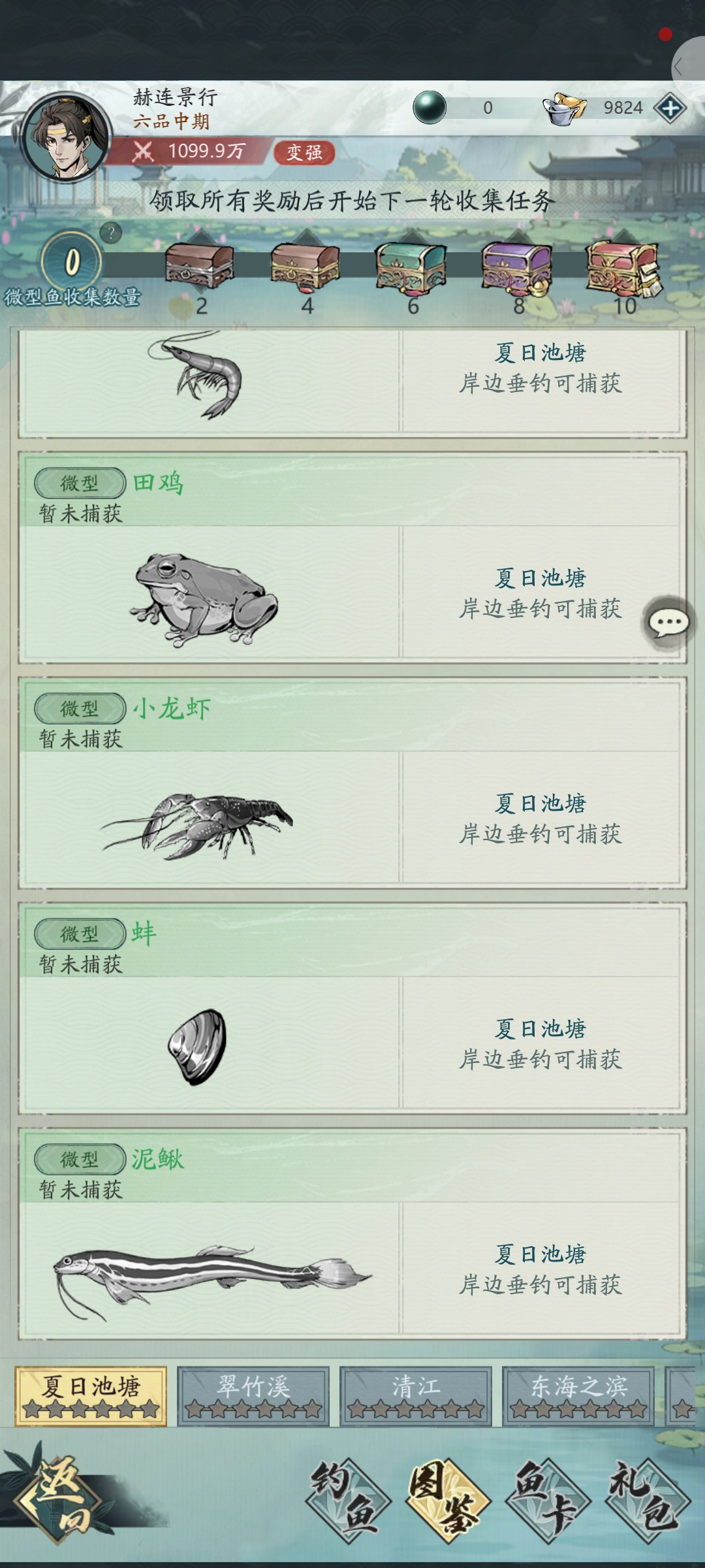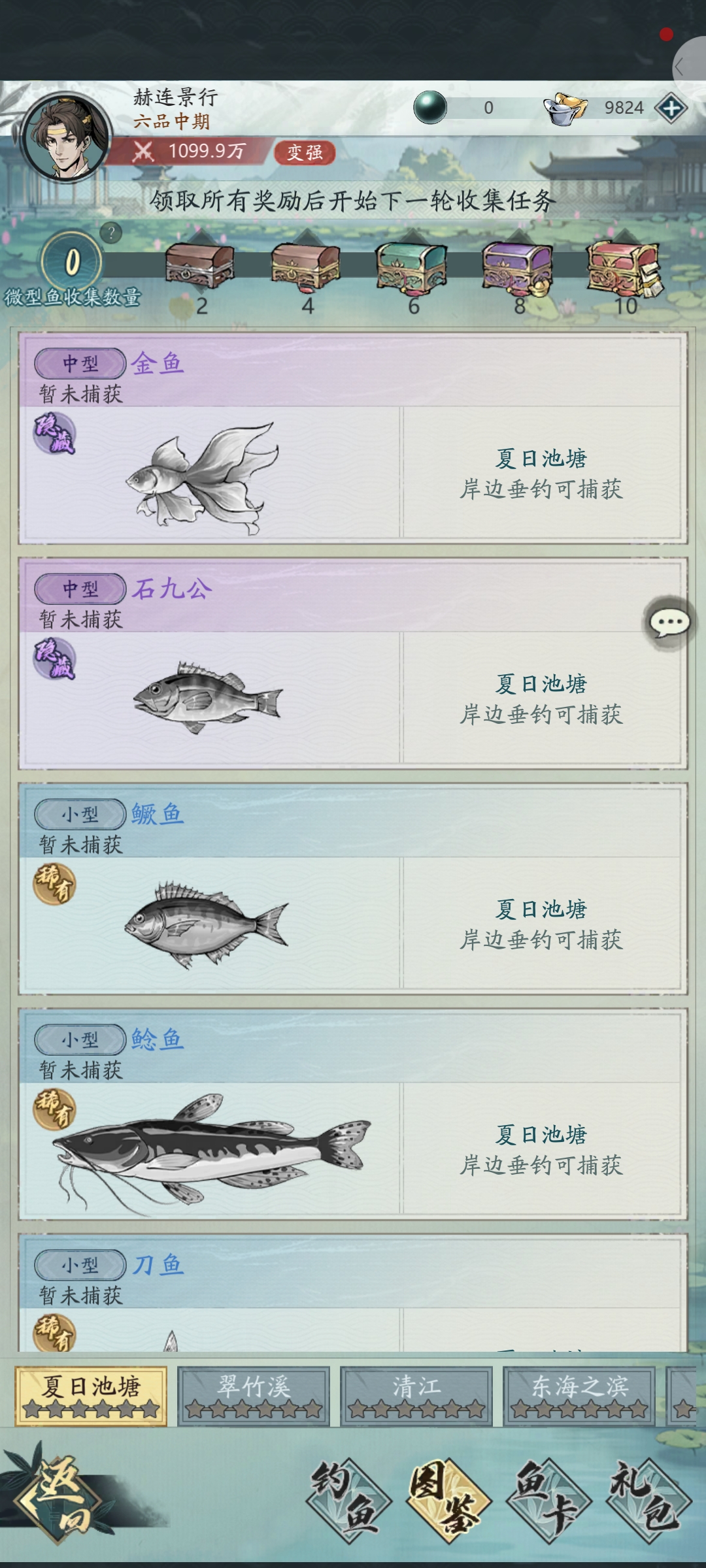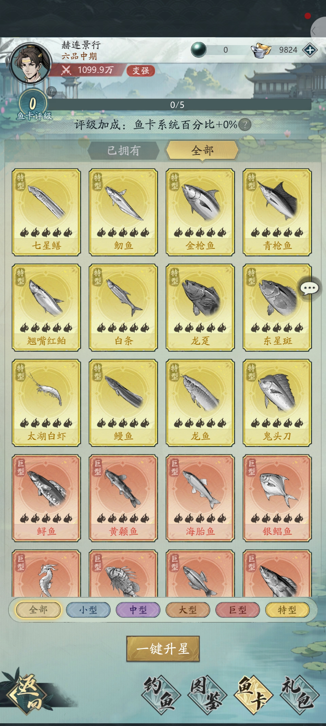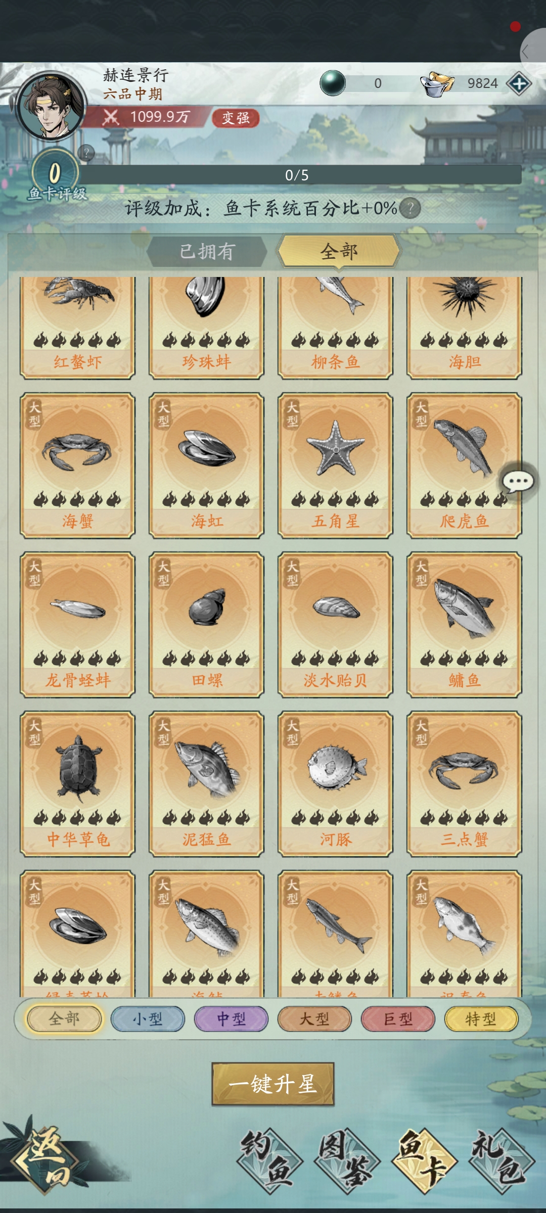 钓鱼图鉴+鱼卡直接把收集感拉满,不同钓点藏着专属鱼种:夏日池塘能钓金鱼、石九公,翠竹溪有虎头鱼,东海之滨能摸海星海胆,越往后的钓点鱼种越稀有~收集微型鱼还能领宝箱,开出来的黑珍珠能换钓鱼商城礼包。鱼卡更实用,用鱼卡包开出来自动生效,重复鱼卡能升级,不仅加属性、涨图鉴加成,还能提高钓到大重量鱼的概率,一键升星直接省事儿~