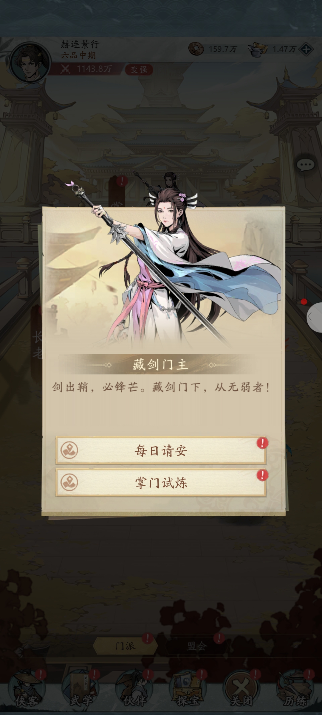 每日请安 作者:一鹿向钱 发布日期:前天 藏剑门主的气场直接拉满,“剑出鞘,必锋芒”这话一出来,门派那股锐气都快溢出屏幕了。刚点了每日请安+掌门试炼,直接抱回2个醒神香、80门派贡献、500传承璞玉——这波门派福利属实给得够实在,六品级的号终于又攒了波资源,舒服! 全部评论 17 最新 最热 君如云中月 昨天 0 来了一波又一波 嫣然 昨天 0 好玩 惜诺 昨天 0 来了来了 夜里 昨天 0 锐气不减 悠悠 昨天 0 气场全开 兰云溪 昨天 0 不太懂这些 PiHriG_⁰⁹¹ 昨天 0 存材料了 贰呆子 昨天 0 这游戏很不错 瑶一瑶 昨天 0 资源多 圆圈 昨天 0 吓唬一下 推荐游戏 查看更多 > 红颜知己 0.1折经商手游来袭,这波首富我当定了! 卡牌 经营策略 超迷足球 这不是游戏而是你的欧冠决赛 挂机 回合 倚天逍遥录 高自由度武侠题材MMORPG巨作 武侠 挂机 摸金校尉之伏魔殿 开服送万元充值卡,自选核心鬼神 卡牌 挂机 无双之王 是谁的DNA动了!地下城爆爽开刷! 魔幻 即时 圣物英雄0.1折 带你开启一段轻松愉快的q萌西游之旅 仙侠 回合 今日热榜