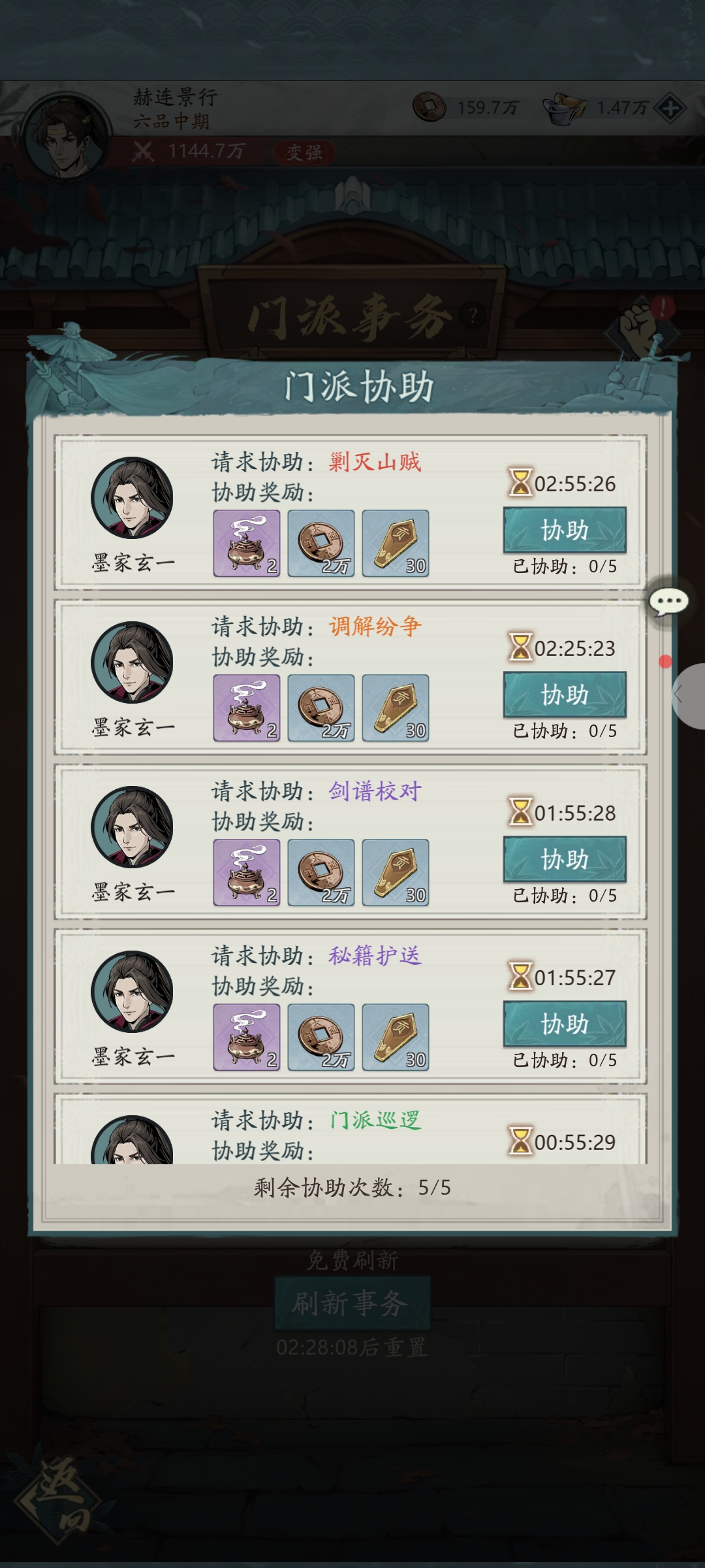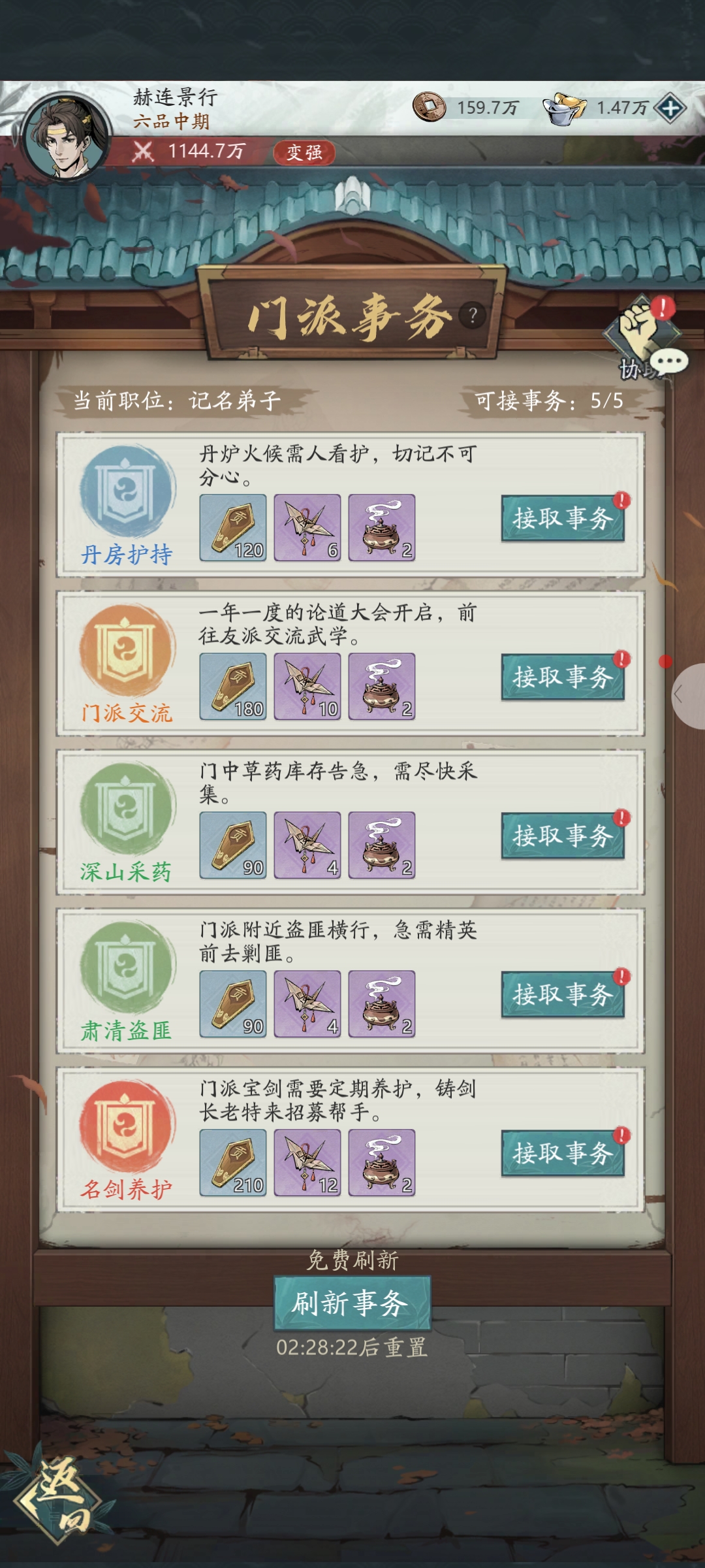 门派事务界面这几个活挺有意思:丹房护持、门派交流这些任务,接了等时间到就能领奖励,品质越高给的越好。每天能接5个,还能免费刷新一次。旁边还有门派协助,帮同门做剿灭山贼这些事,给醒神香和门派贡献,今天的协助次数还没用完。先把这几个高奖励的事务接了,再顺手帮同门助个力,资源能攒不少。