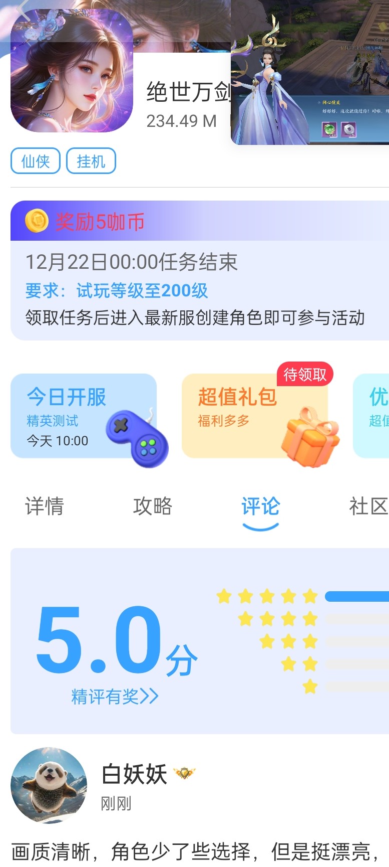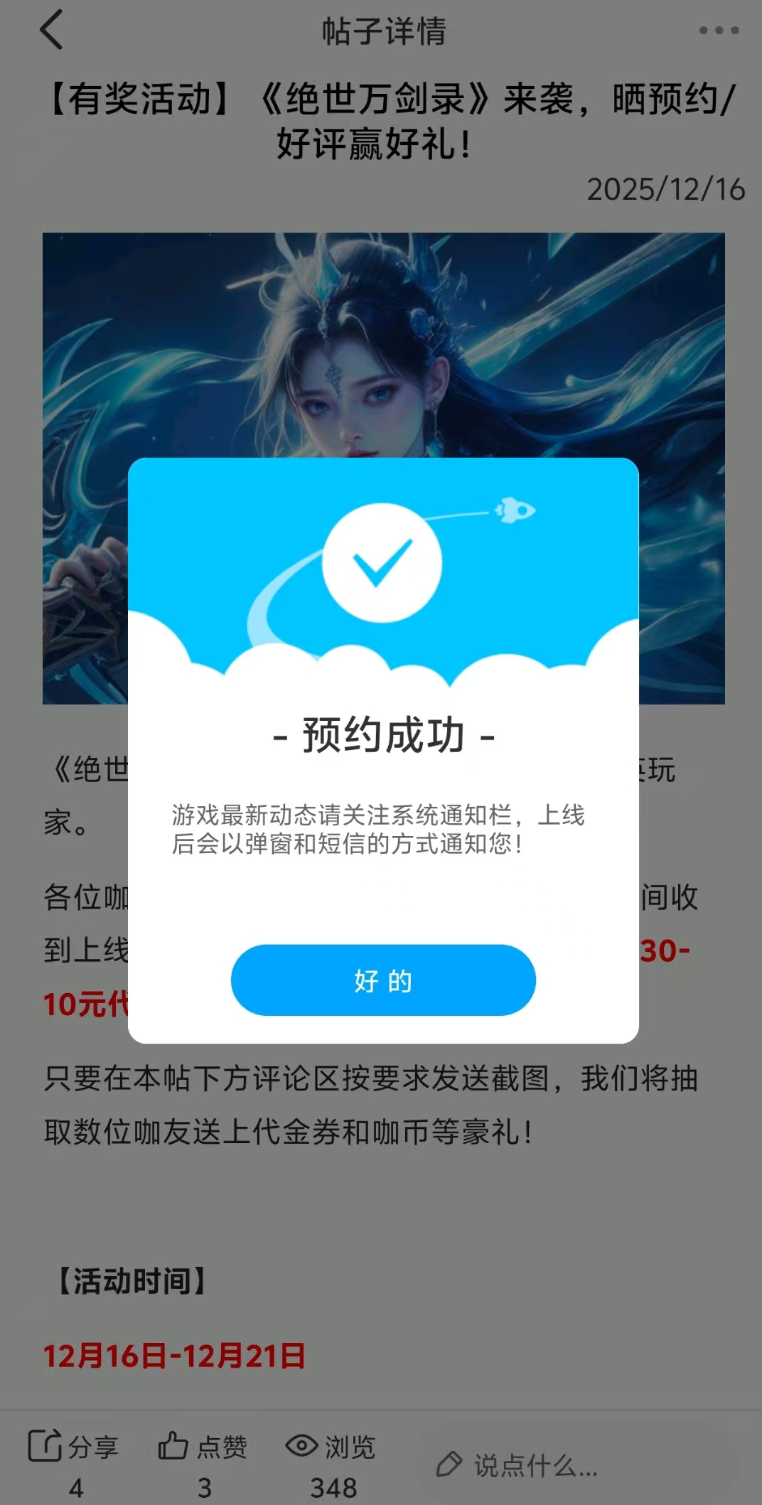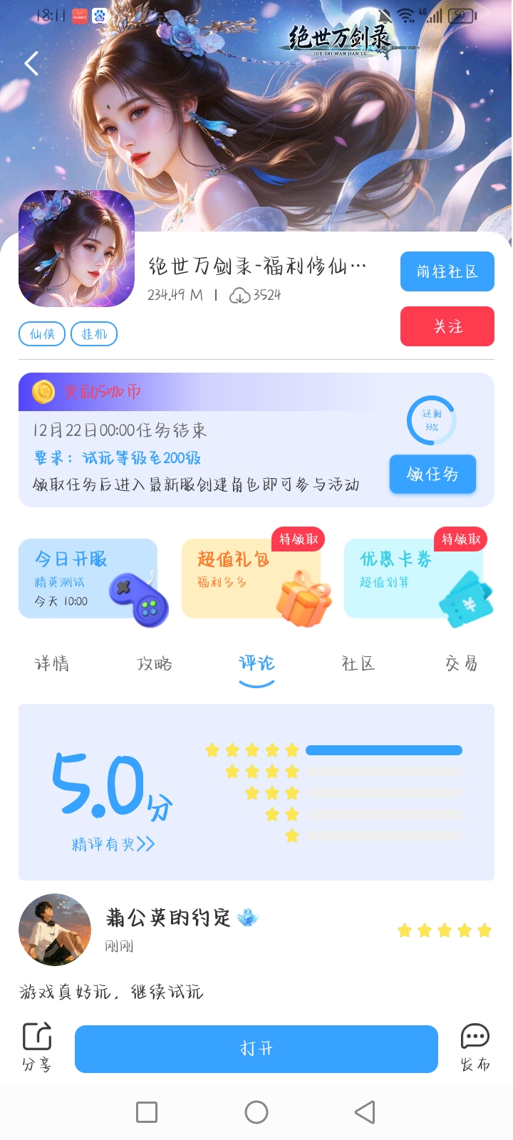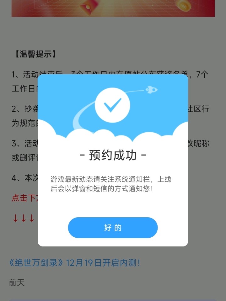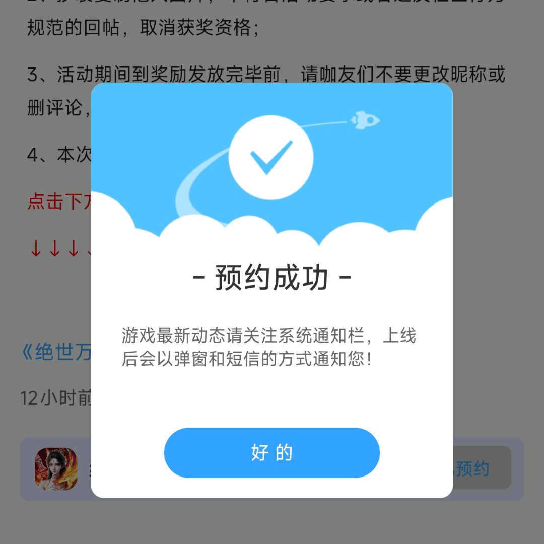 在本帖评论区分享预约游戏加首发后对《绝世万剑录》的五星好评截图,即是成功参与~