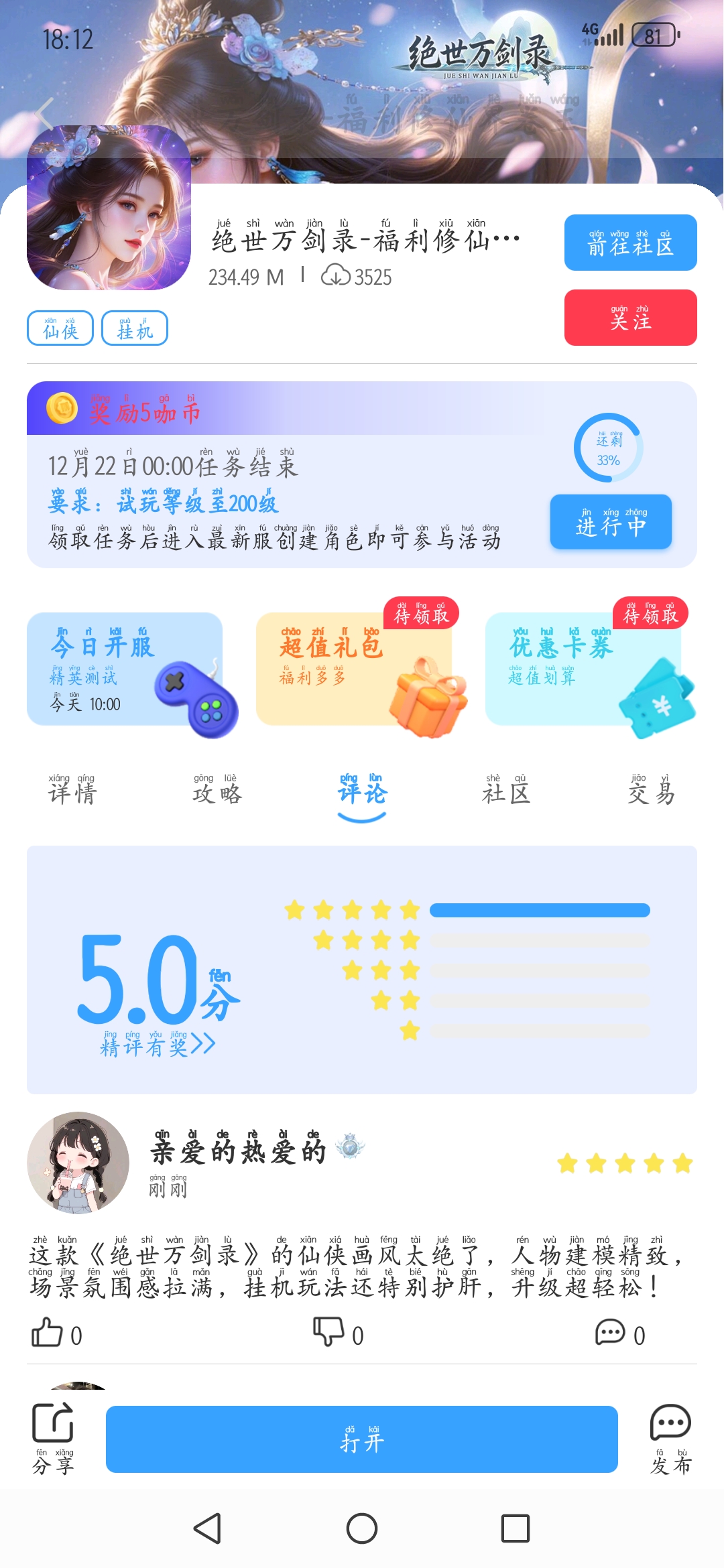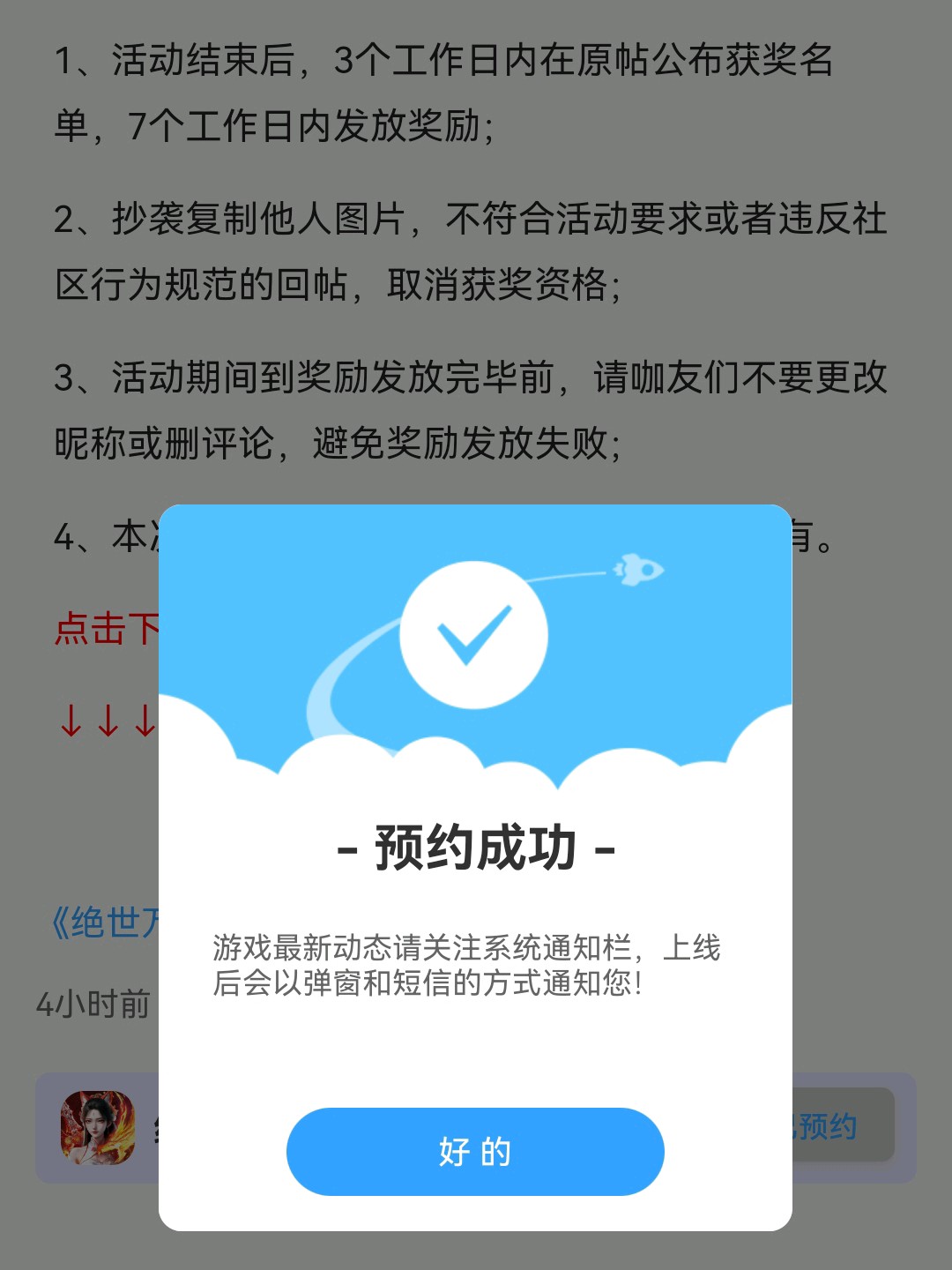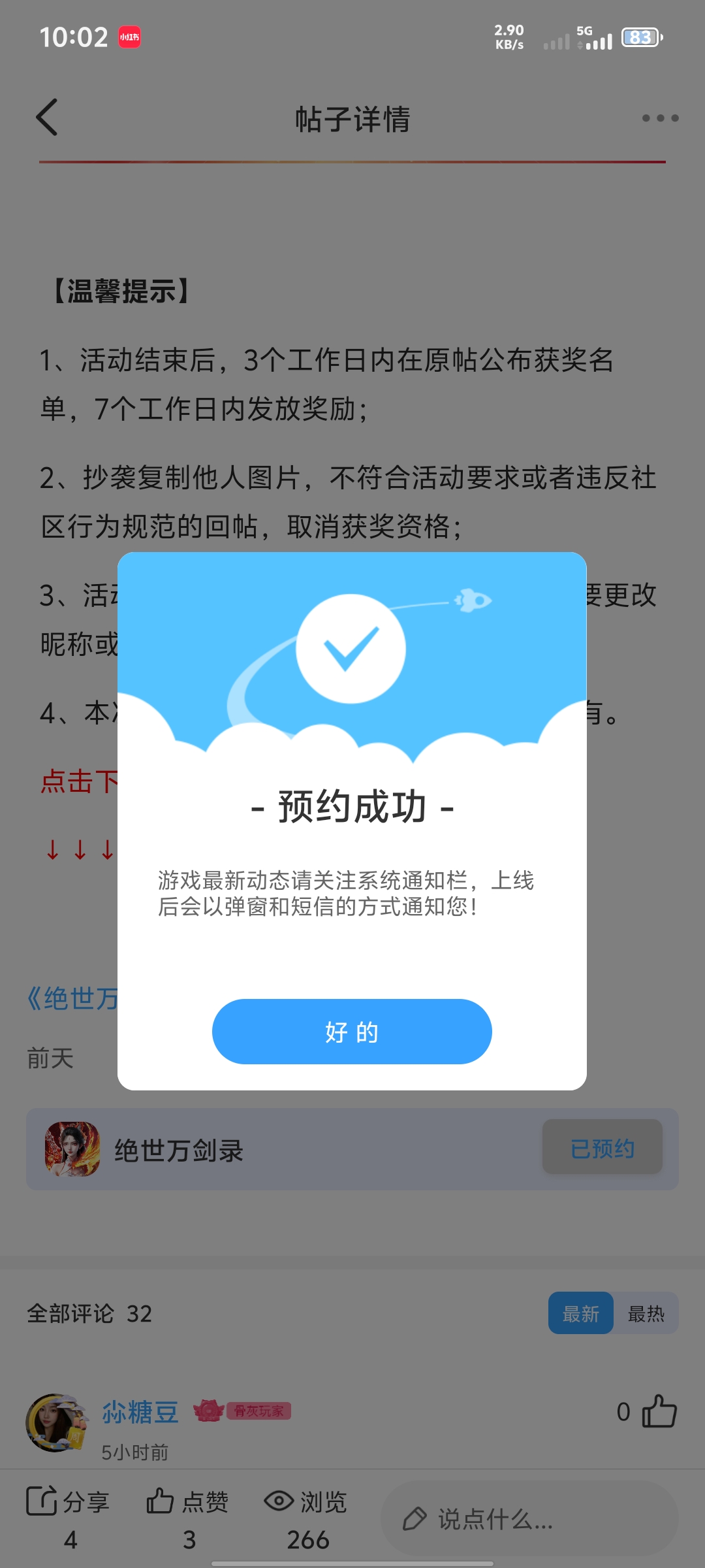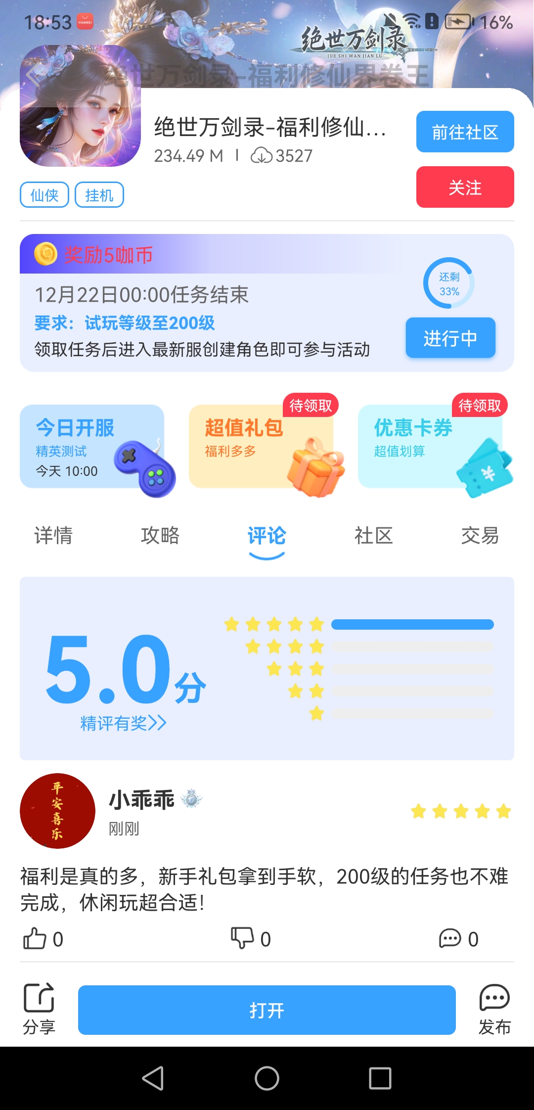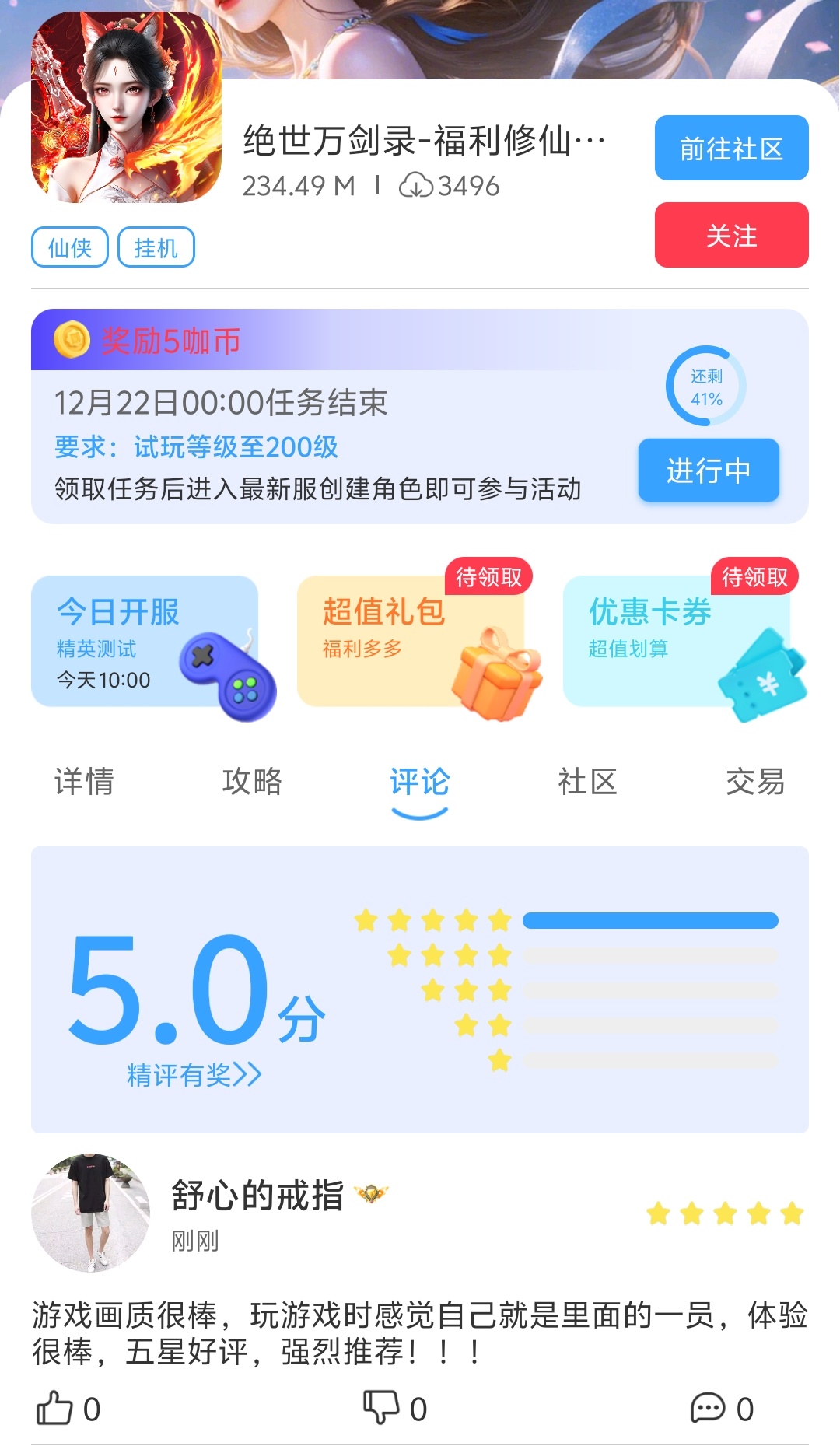 在本帖评论区分享预约游戏加首发后对《绝世万剑录》的五星好评截图,即是成功参与~