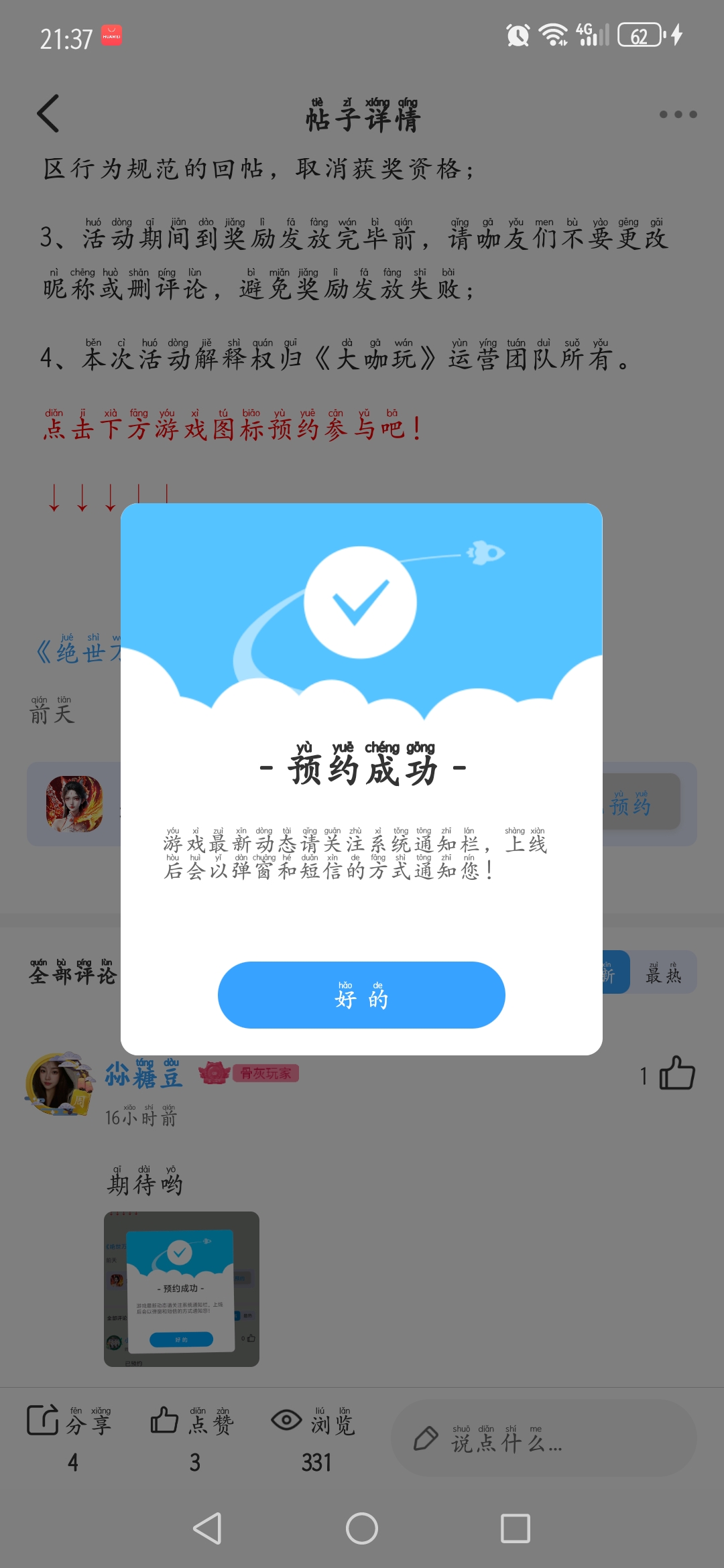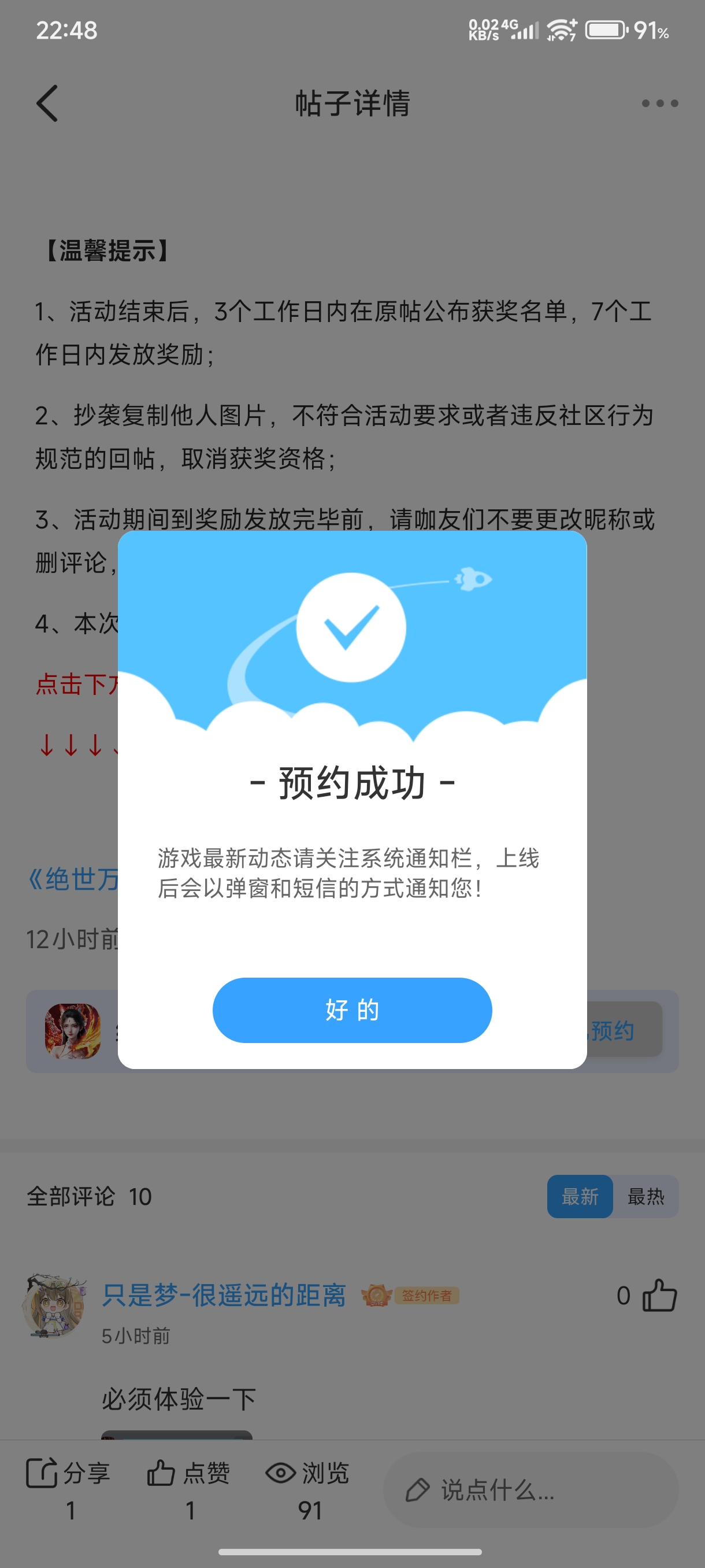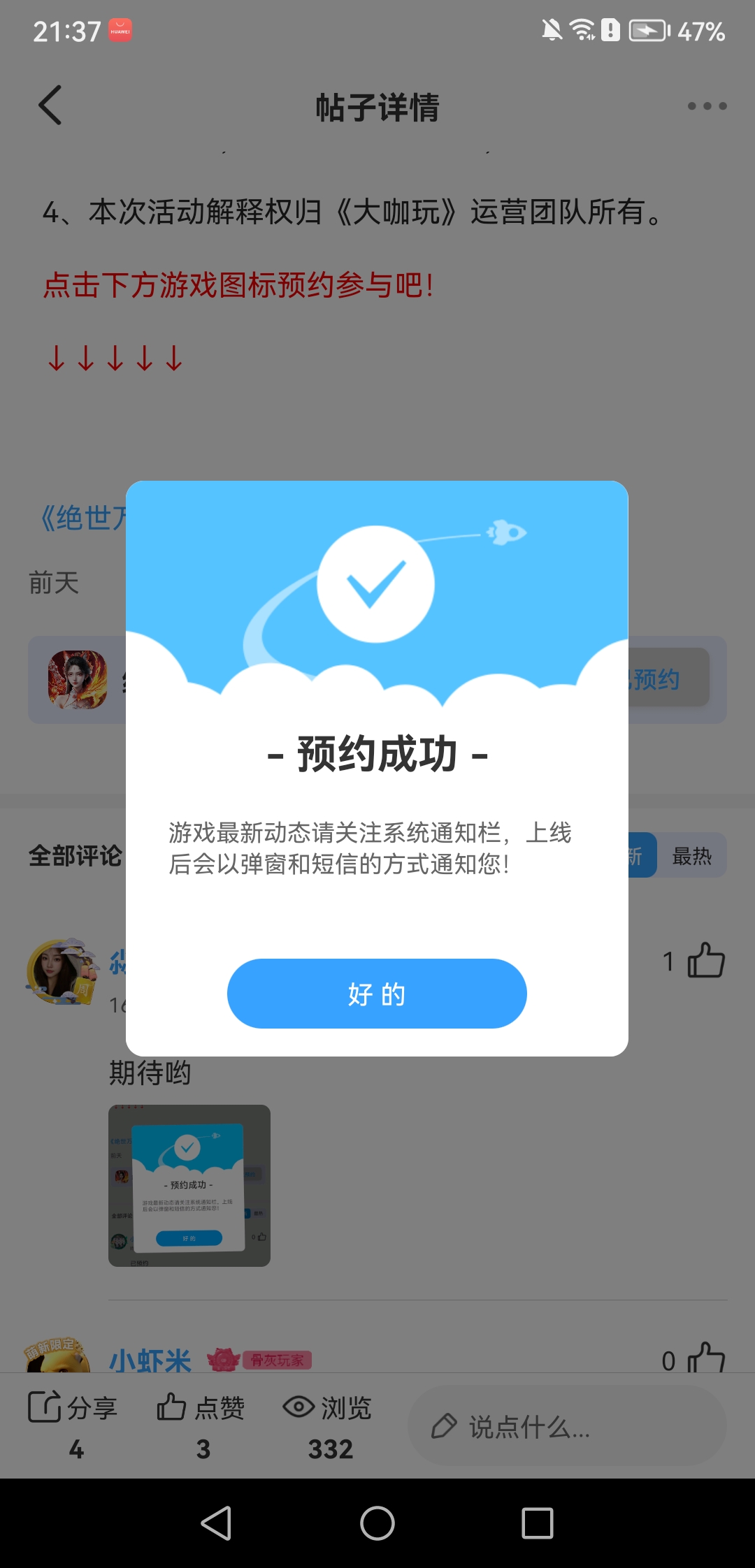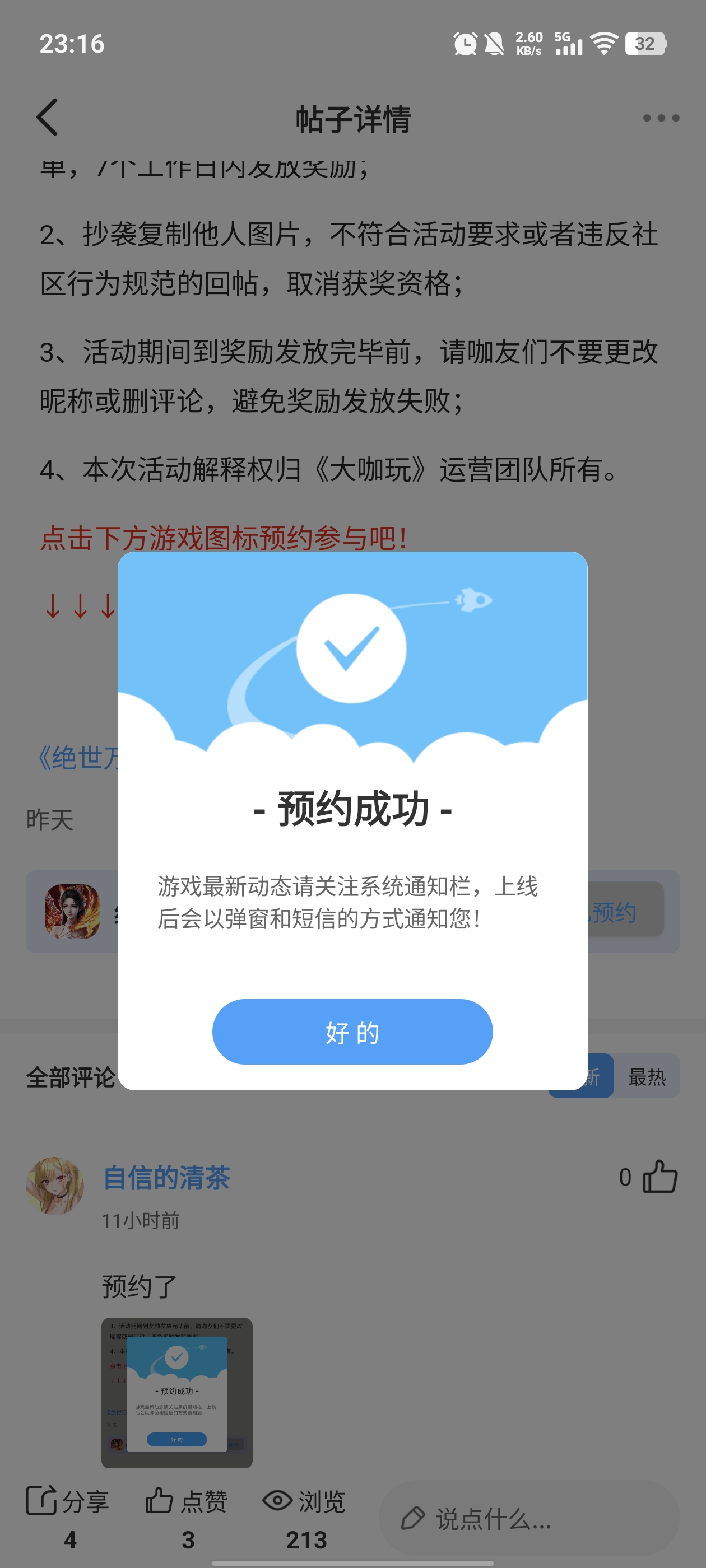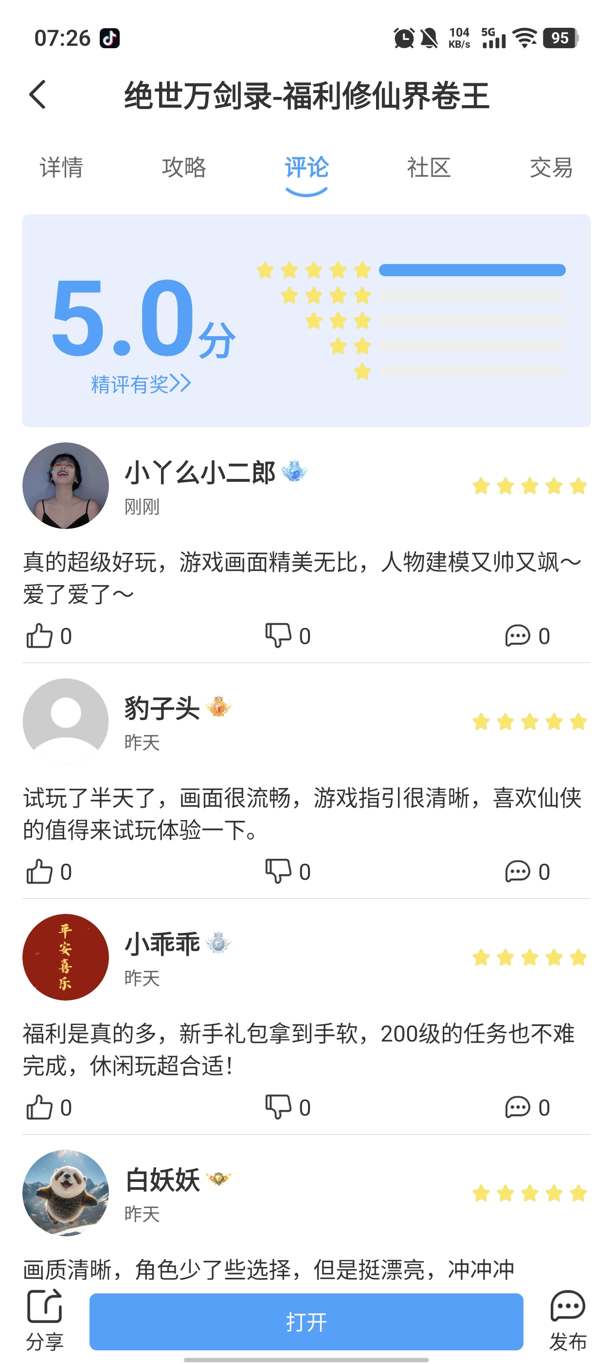 在本帖评论区分享预约游戏加首发后对《绝世万剑录》的五星好评截图,即是成功参与~