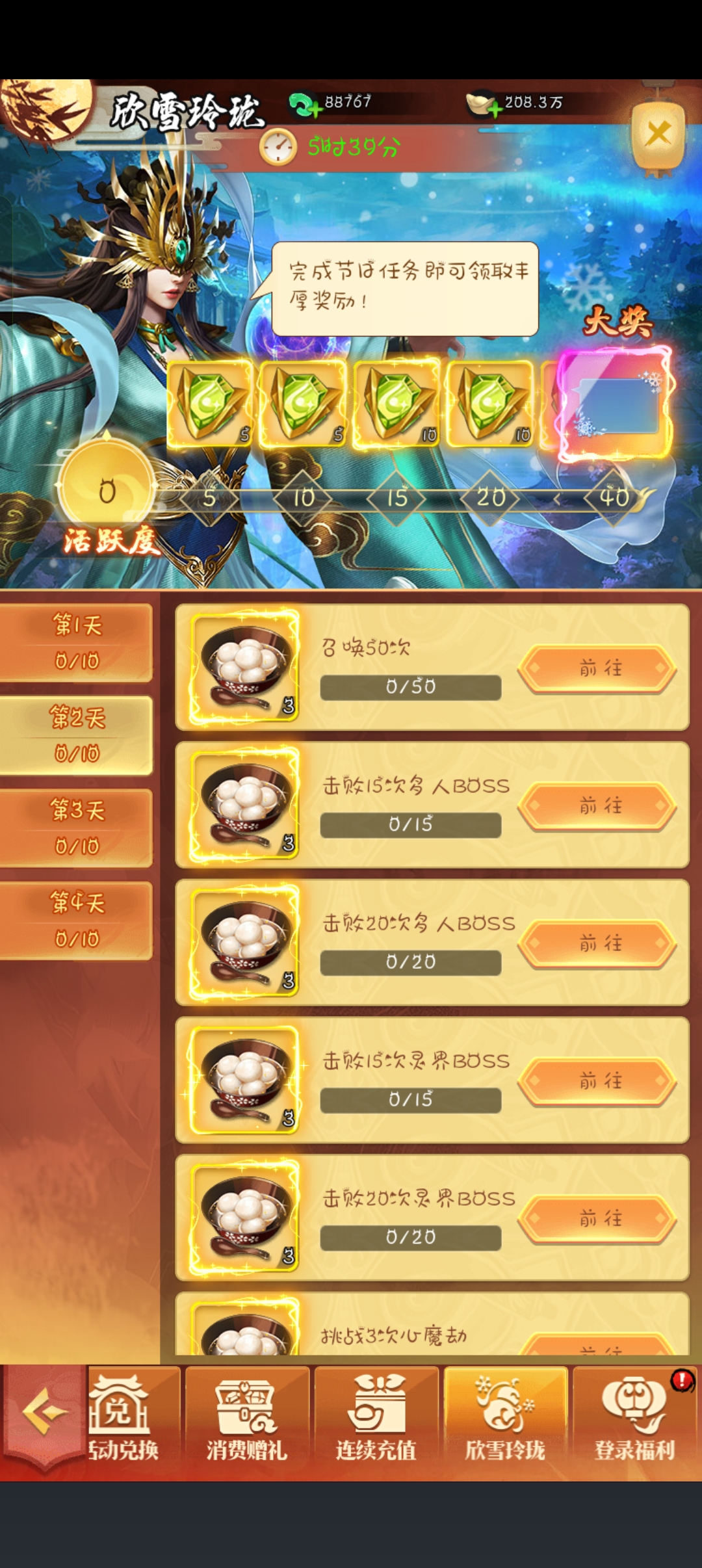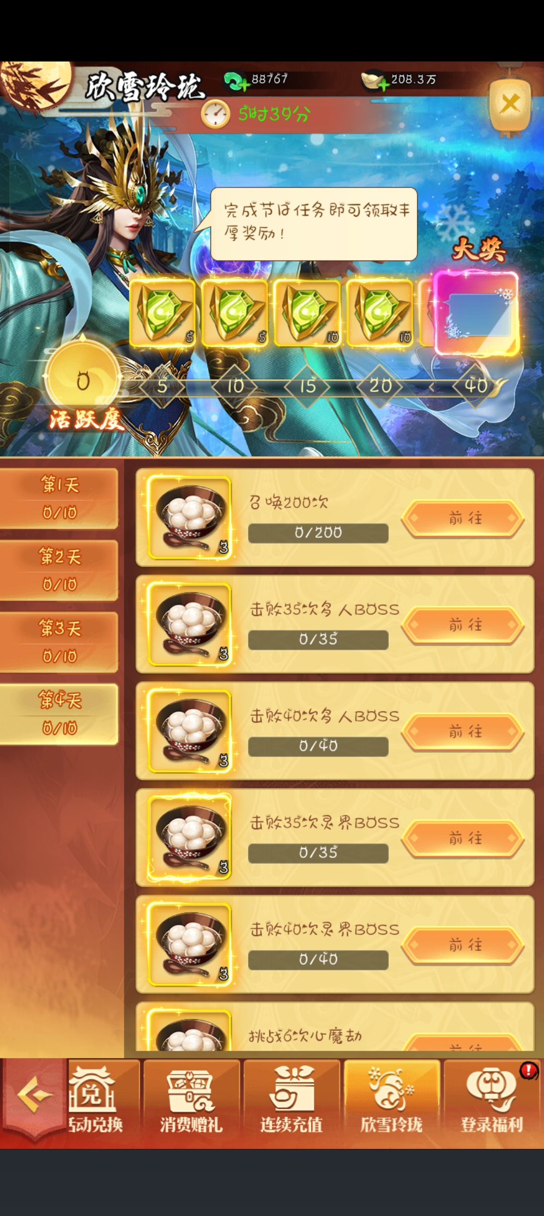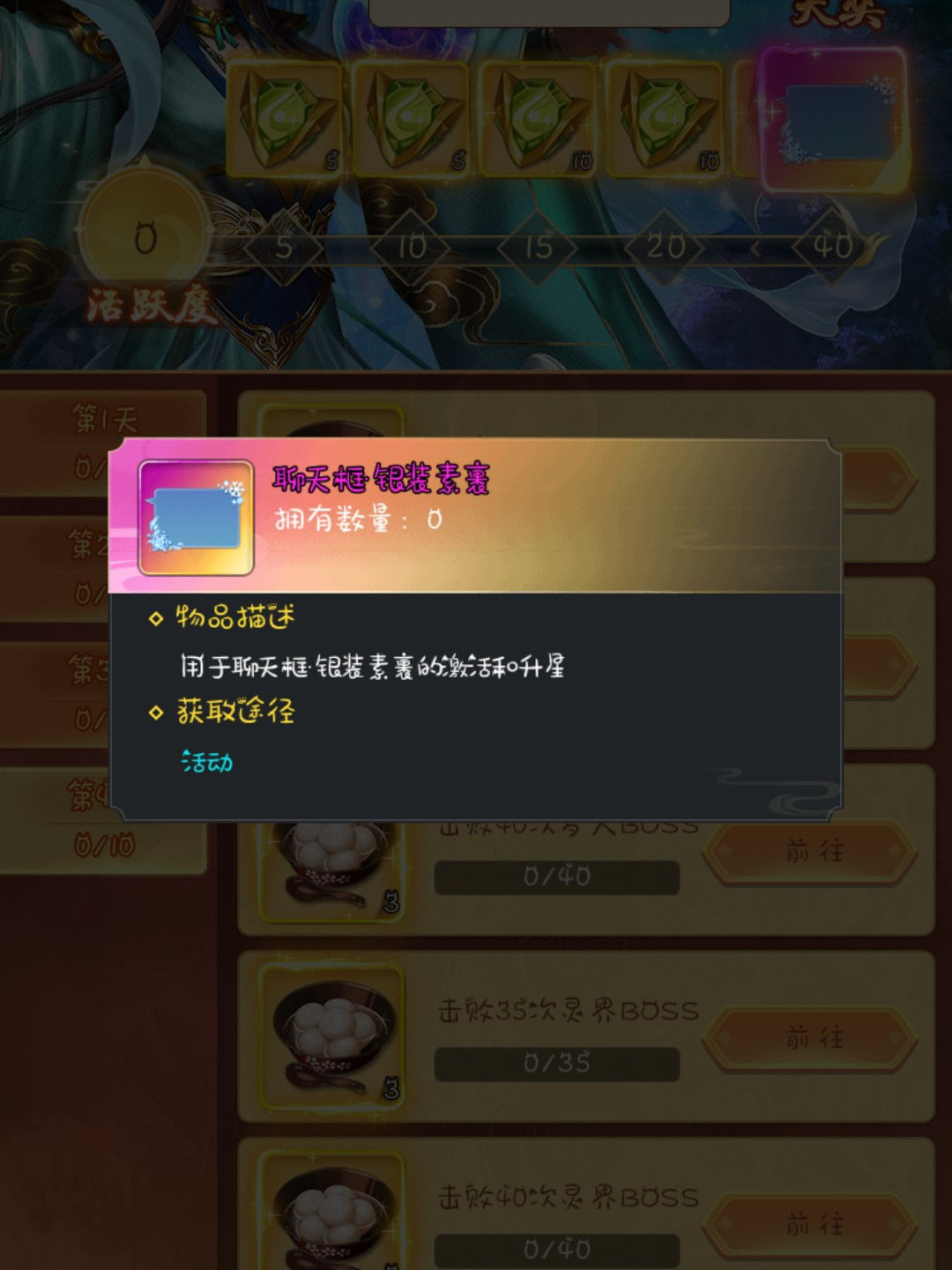 欣雪玲珑节日活动以任务闯关的形式为玩家送上丰厚福利,限时5小时的设定让这份惊喜更具收藏价值。活动核心是积累活跃度解锁奖励,从绿色珍稀道具到终极大奖银装素裹聊天框,奖励梯度清晰且诚意满满,任务难度随天数逐步提升,第一天需完成召唤10次、击败多人/灵界BOSS等基础任务,到第四天则要求召唤200次、击败40次灵界BOSS等高阶挑战,每完成一项任务可获得汤圆道具,同时积累活跃度。终极大奖银装素裹聊天框,不仅能美化聊天界面,碎片还可用于升星,是颜值与实用性兼备的装饰。虽然高难度任务对玩家战力和时间有一定要求,但完成任务就能免费获取绝版聊天框,对于喜欢收集游戏装饰的玩家来说,这场节日活动绝对值得全力冲刺。