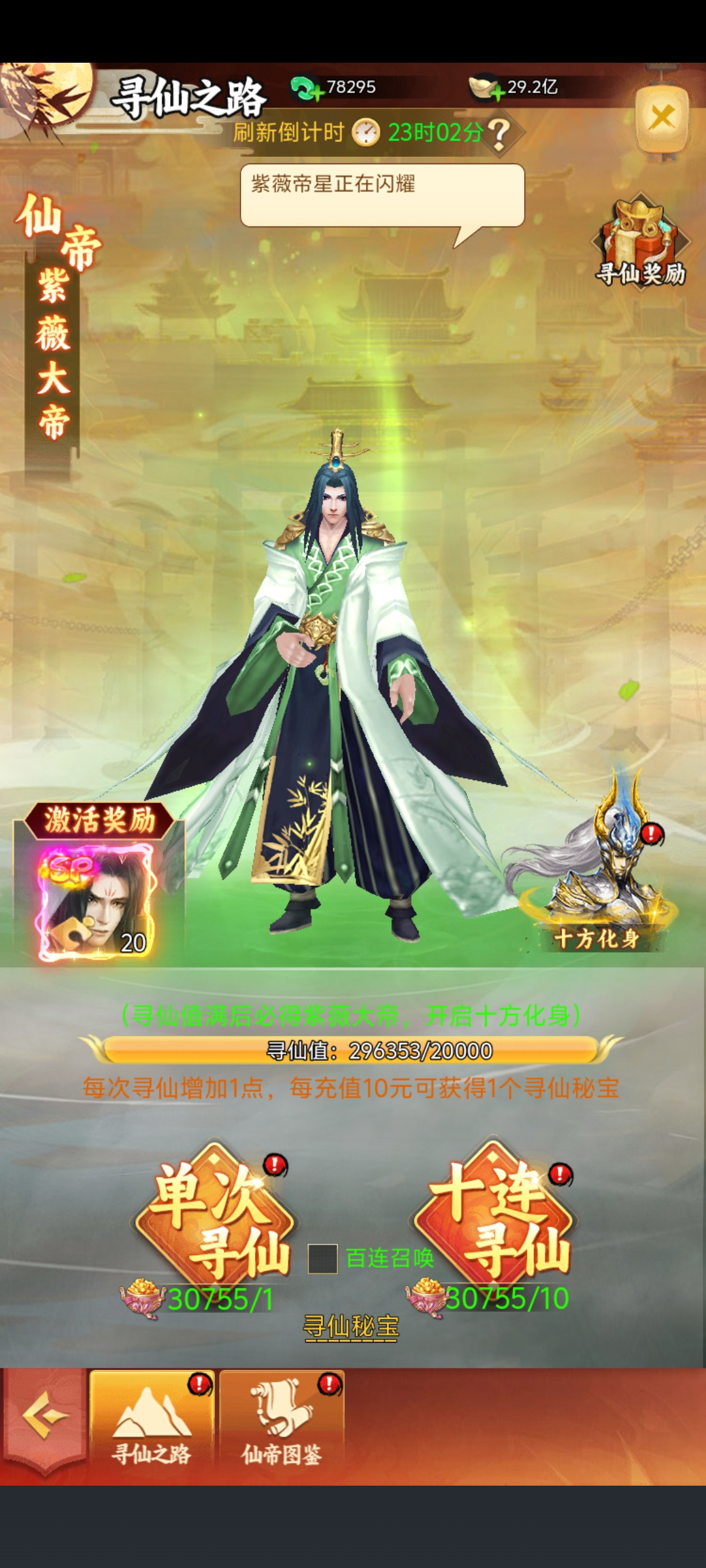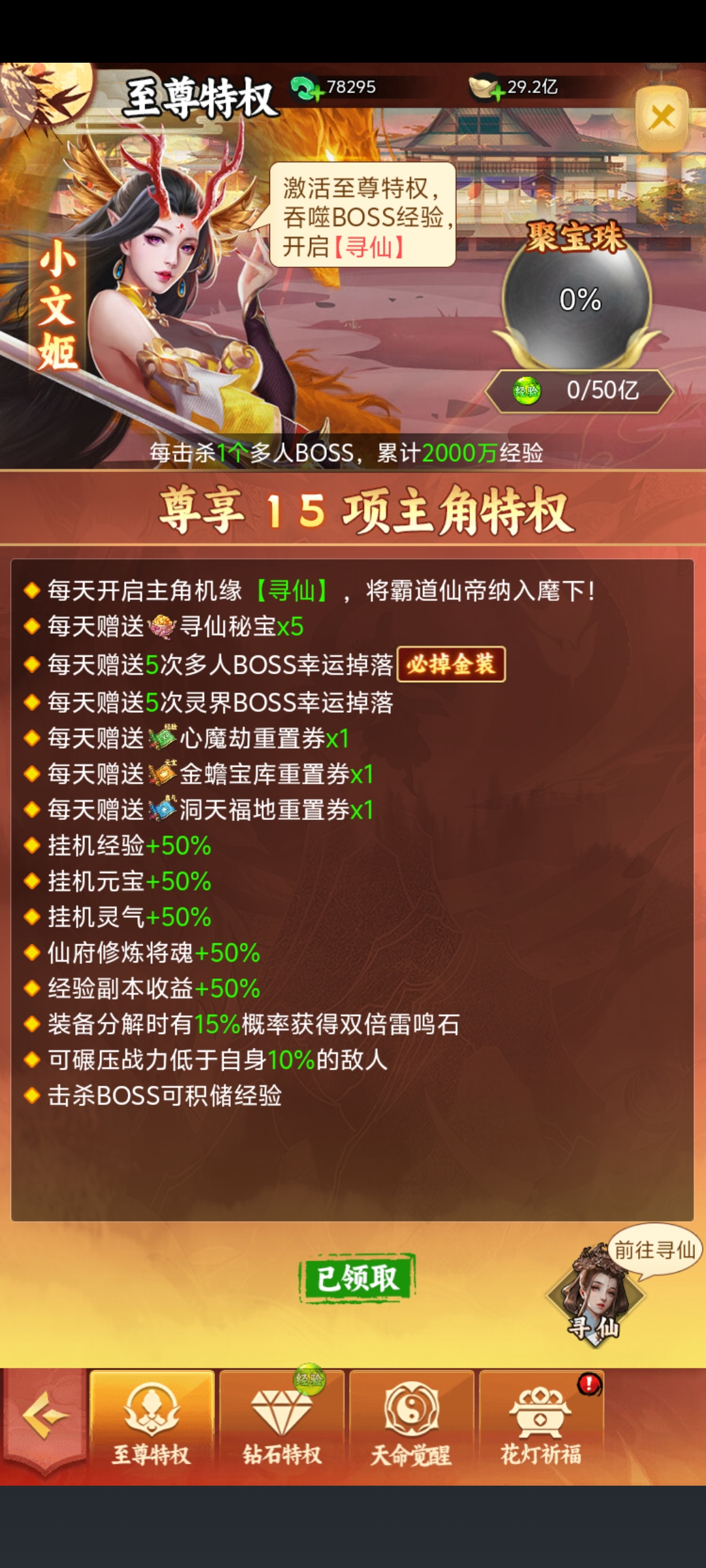 激活特权后,每天能开启主角机缘——寻仙,把霸道仙帝收入麾下,还能领5个寻仙秘宝,以及5次多人BOSS、5次灵界BOSS的幸运掉落机会,这些掉落能必出金装。另外每天还能领心魔劫、金蟾宝库、洞天福地的重置券各1张。