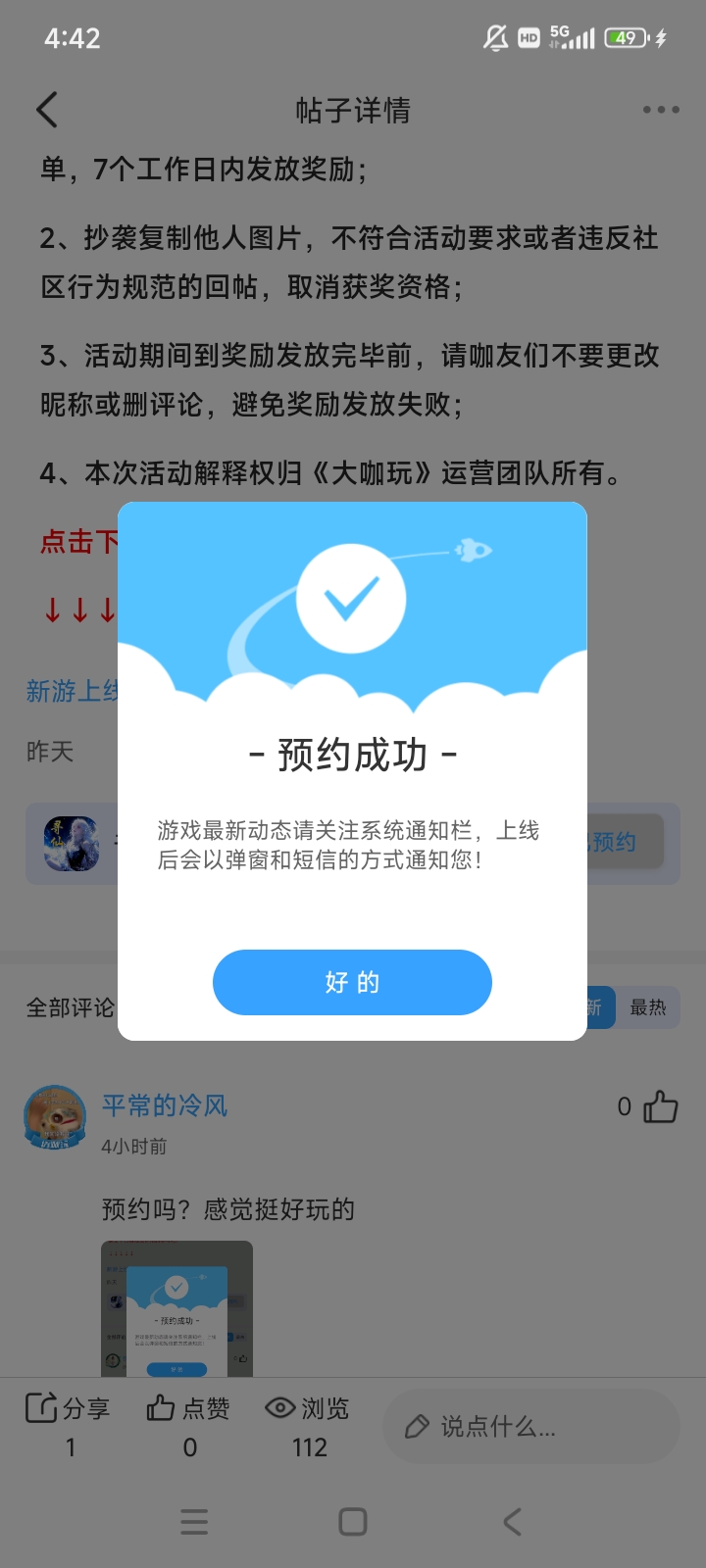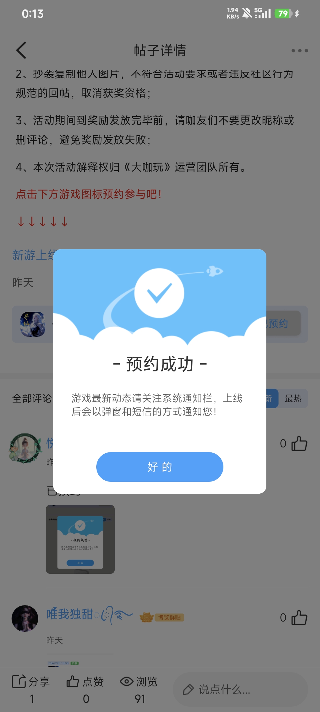 在本帖评论区分享预约游戏或首发后体验游戏截图或五星好评截图、评论,即可参与~