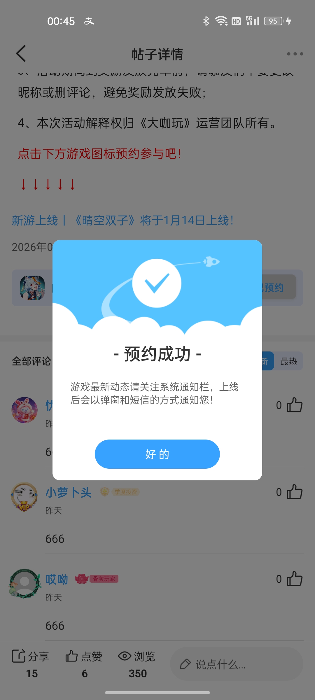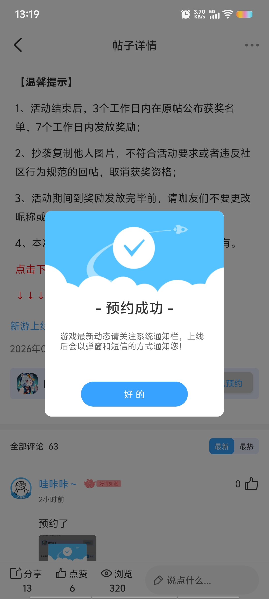 在本帖评论区分享预约游戏或首发后体验游戏截图或五星好评截图、评论,即可参与~