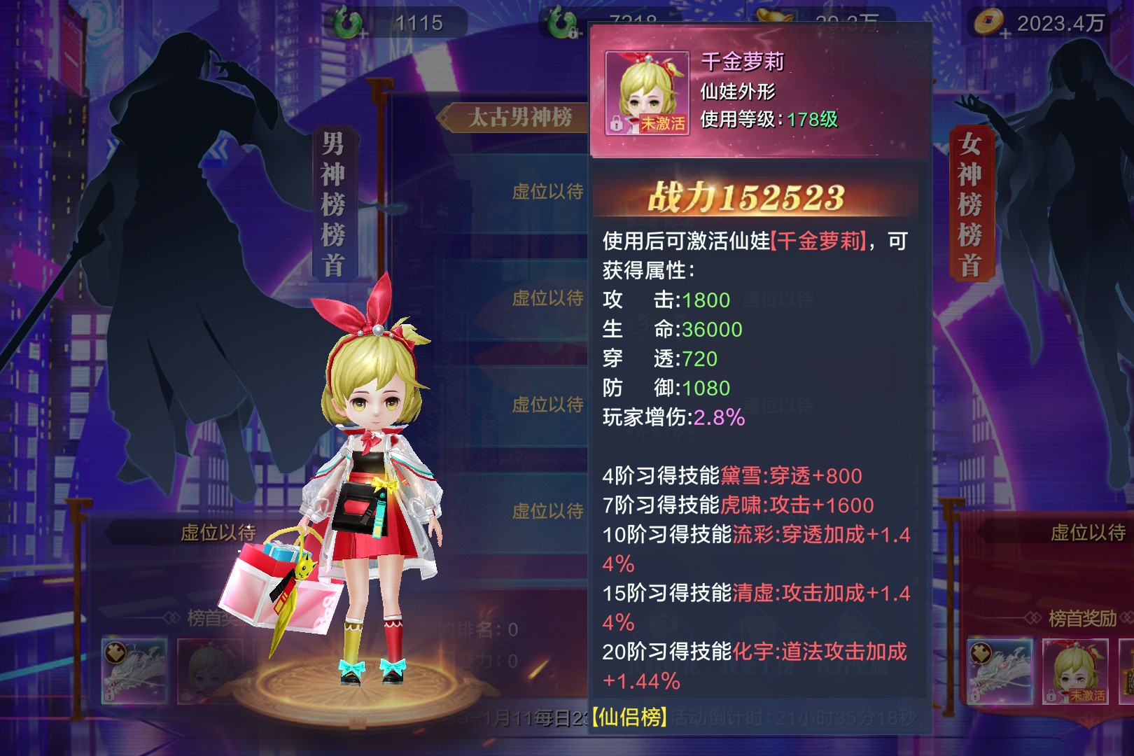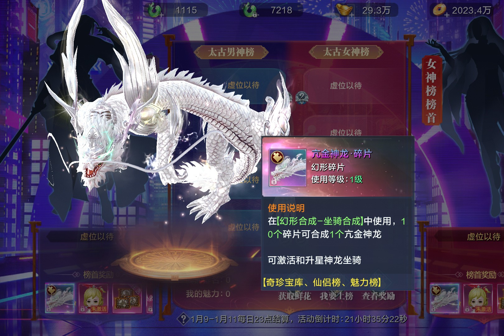 魅力之王活动太古男神榜与女神榜同步开启,每日23点结算排名,上榜即可赢取亢金神龙、千金萝莉等珍稀奖励。亢金神龙作为顶级坐骑,需10个碎片合成,激活后可大幅提升战力;千金萝莉仙娃不仅外形可爱,更能提供攻击+1800、生命+36000等属性加成,还有多种技能助力战斗。活动期间,仙友们可通过获取鲜花提升魅力值冲榜,排名越高奖励越丰厚。无论是追求顶级坐骑的战力党,还是喜爱萌系仙娃的颜值党,都能在这场魅力比拼中收获满满。活动倒计时已启动,速来参与,成为太古仙界的魅力之王!
