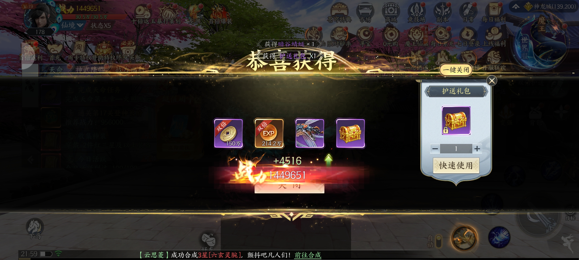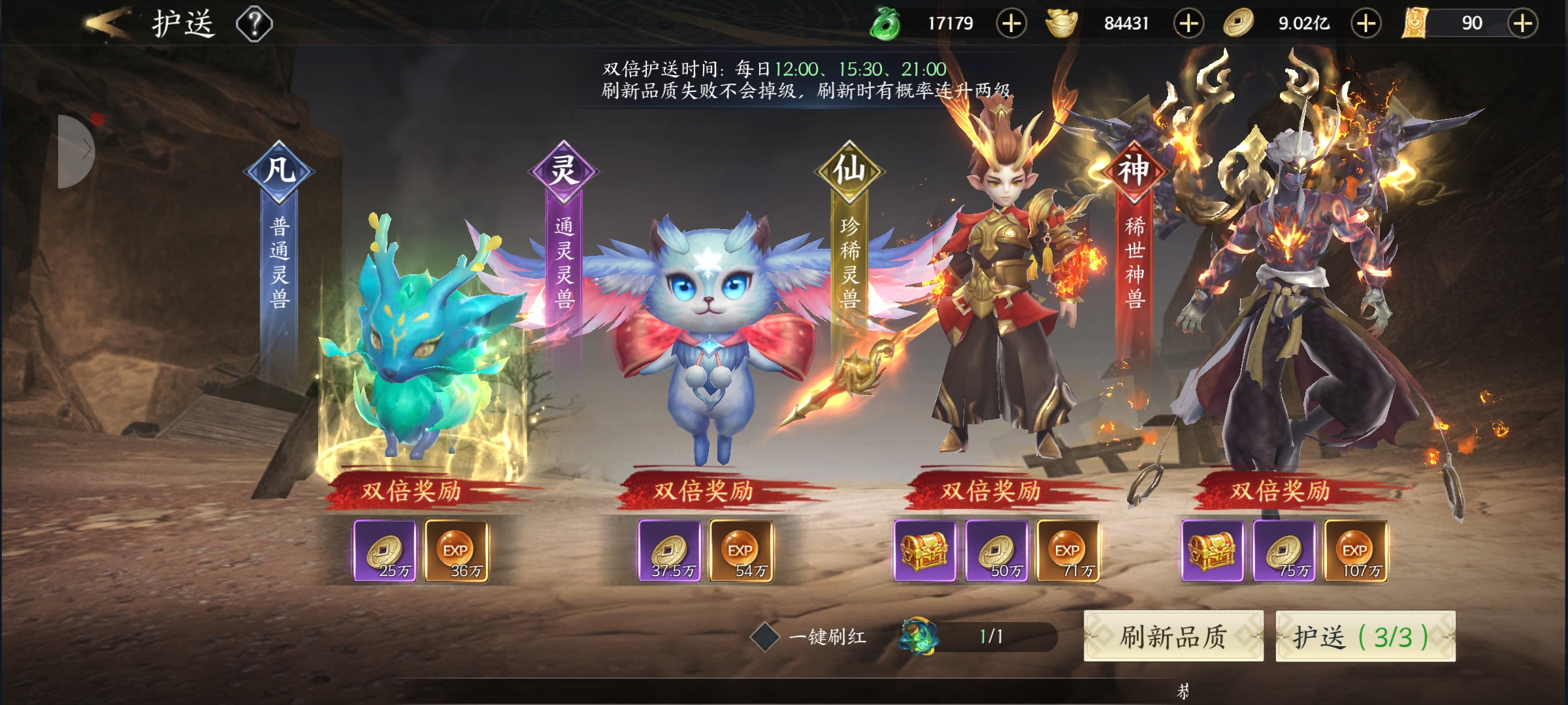护送玩法:每天能护送3次灵兽,双倍活动时间(12:00、15:30、21:00+)奖励会翻倍,0点重置次数。品质能用护送卷轴刷新,品级越高奖励越多,还能一键刷到稀世神兽,刷新成功也不会掉级。我每次护送完,都能拿到铜钱、经验这些奖励,战力跟着涨,大家也赶紧试试,薅一波奖励+!