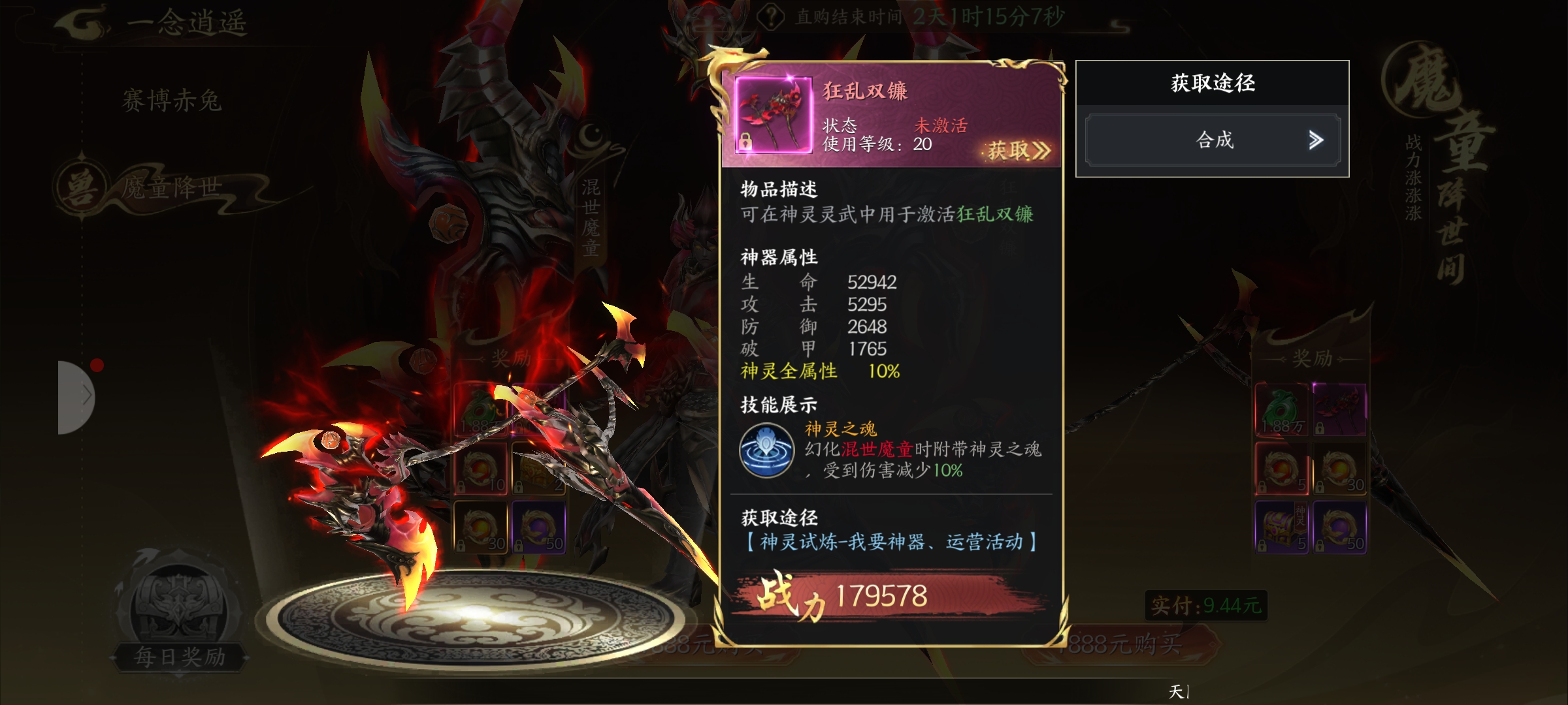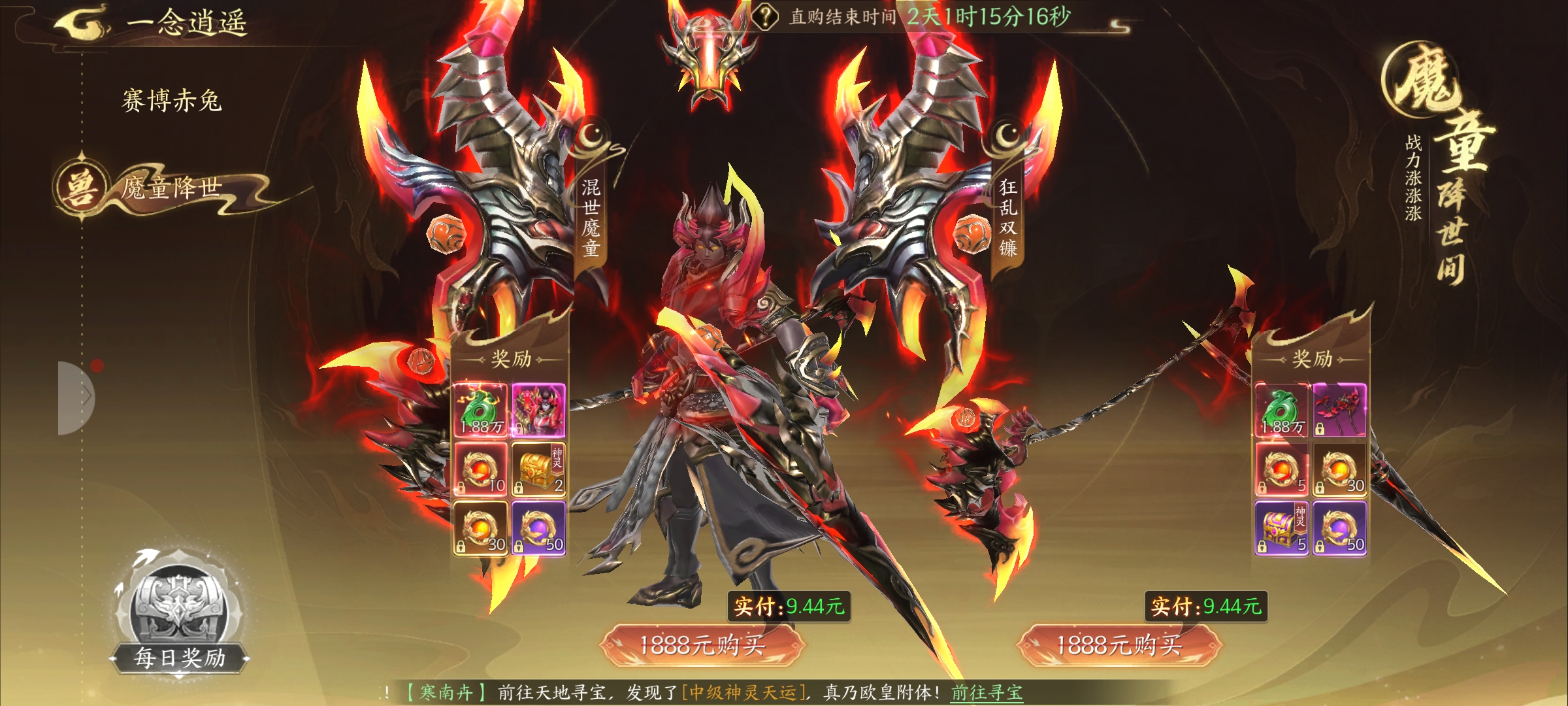 魔童降世直购活动非常给力,原价1888元,现实际支付只要9.44元,就能拿到混世魔童、狂乱双镰这些超厉害的神灵,战力直接飙升。还有高级神灵天运、橙神灵神格随机箱,对提升神灵超有用。灵玉也能到手,能去商城买道具。想变强的可千万别错过,赶紧入手+!