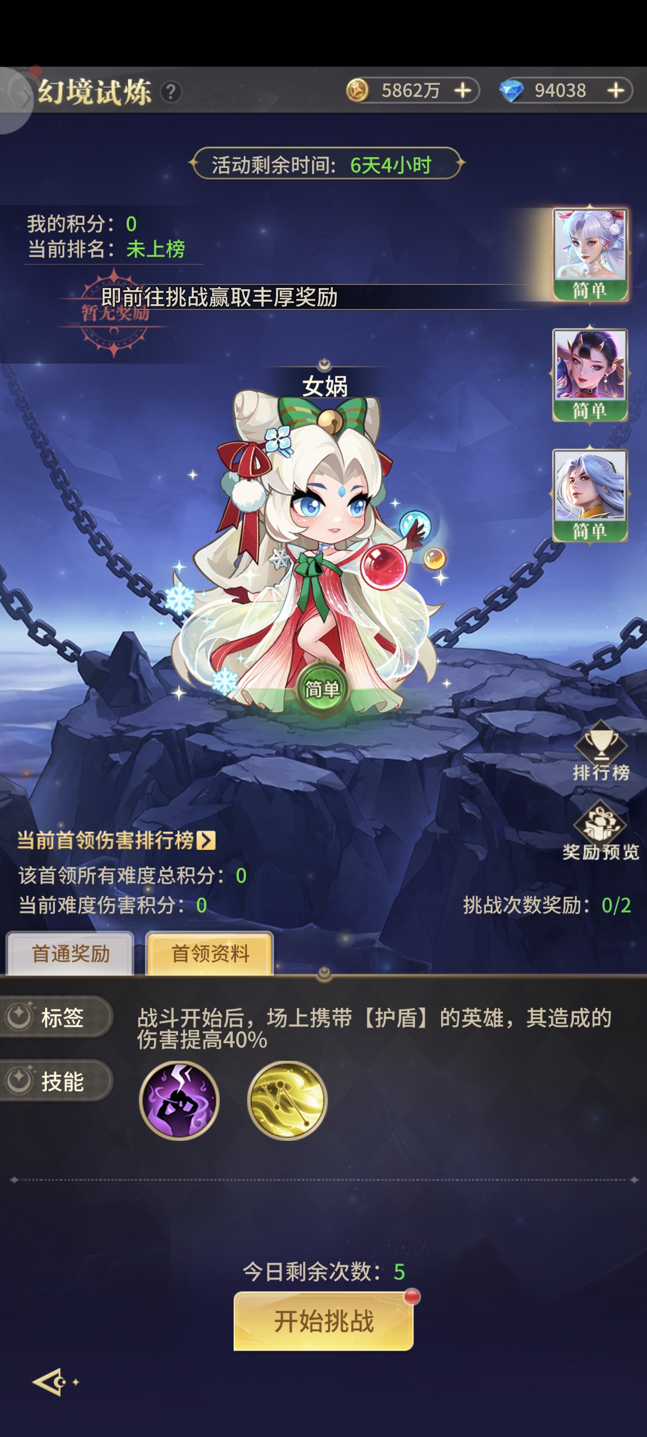 +排名积分为所有首领的所有难度历史最高积分总和。+玩家每日有5次挑战次数,每日00:00重置。