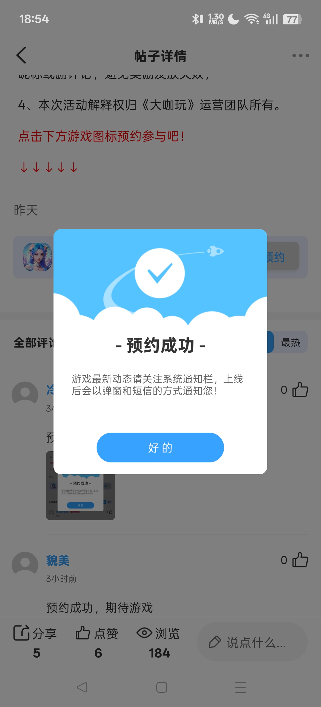 在本帖评论区分享预约游戏或首发后体验游戏截图或五星好评截图、评论,即可参与~