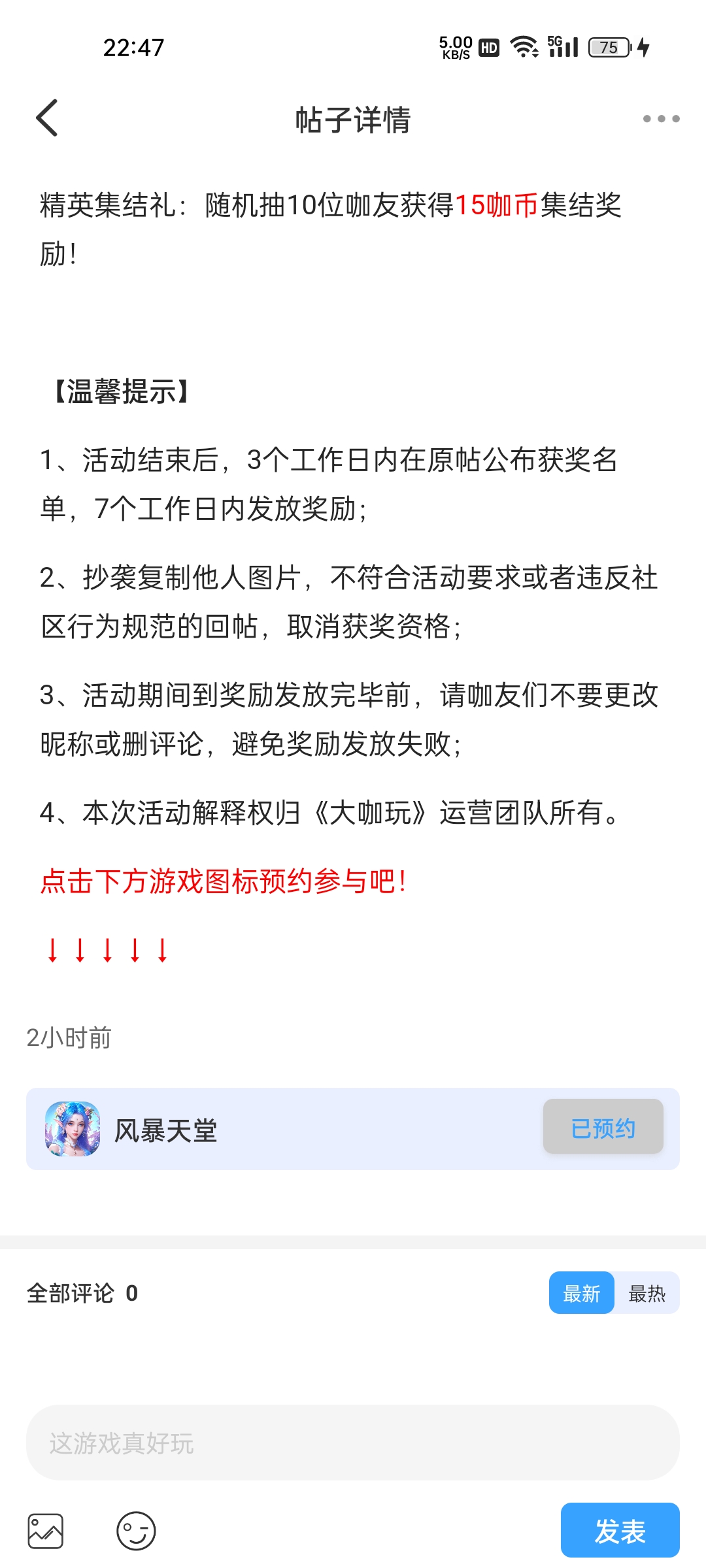在本帖评论区分享预约游戏或首发后体验游戏截图或五星好评截图、评论,即可参与~
