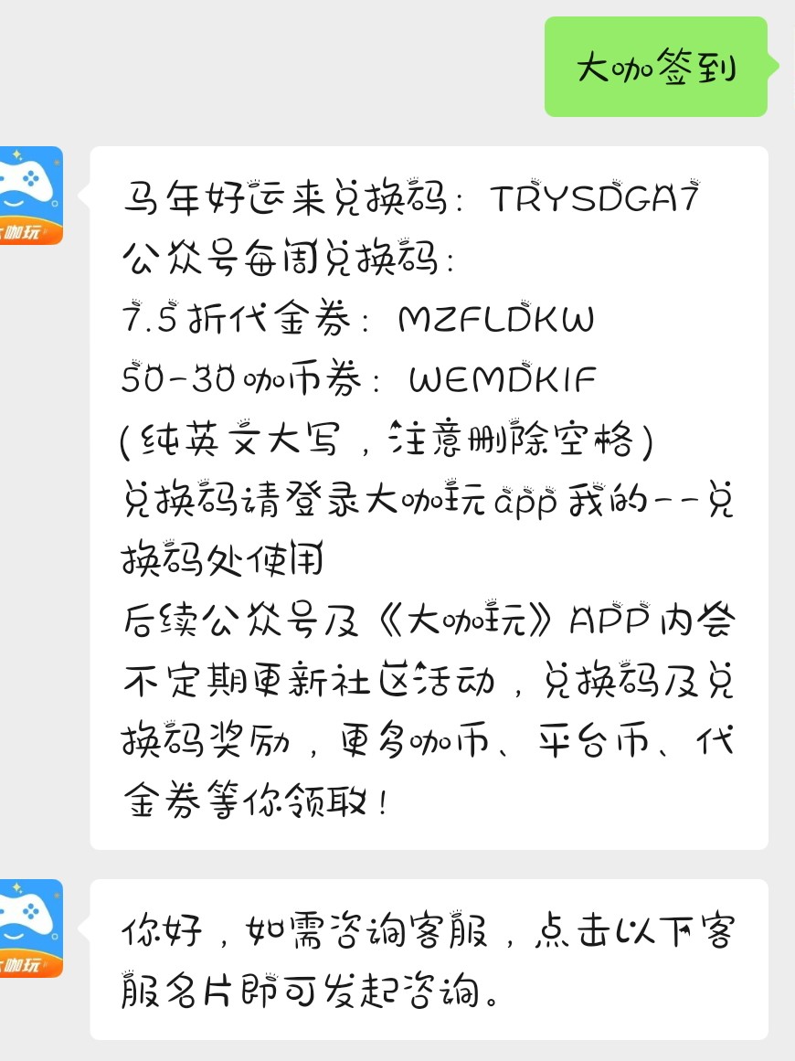 领取方式:微信扫码关注或微信搜索:[[大咖玩]]→关注公众号→发消息(大咖签到)→复制兑换码→打开大咖玩APP兑换!