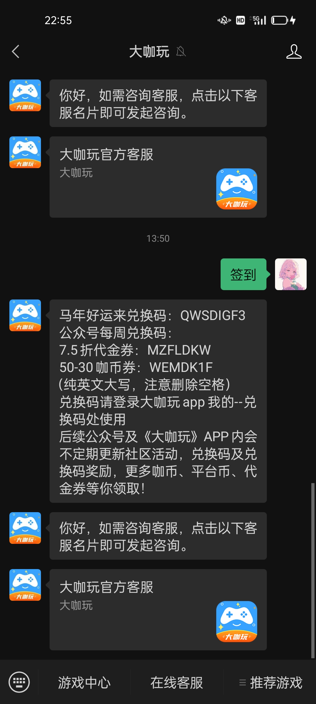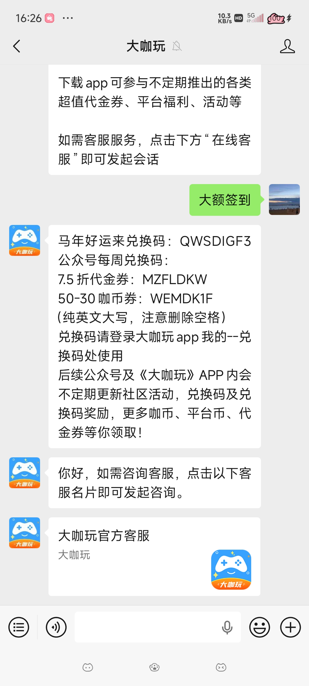 领取方式:微信扫码关注或微信搜索:[[大咖玩]]→关注公众号→发消息(大咖签到)→复制兑换码→打开大咖玩APP兑换!
