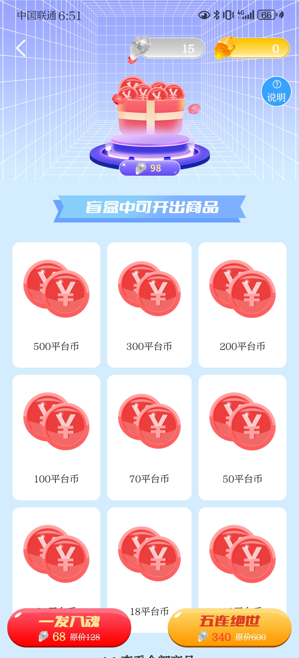 ‌可开出的平台币奖励‌:盲盒内含7种不同面额的平台币,分别是500、300、200、100、70、50、18平台币