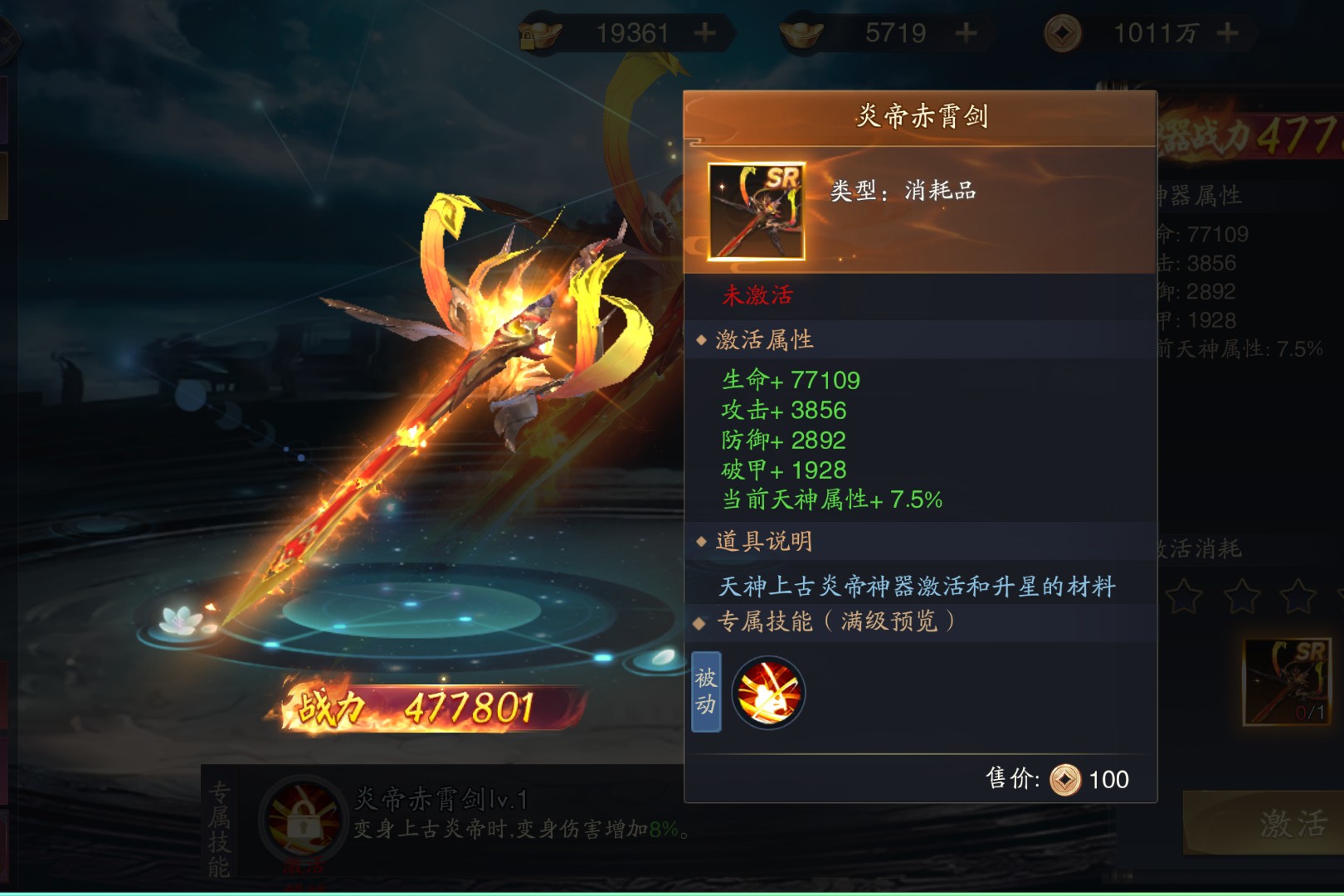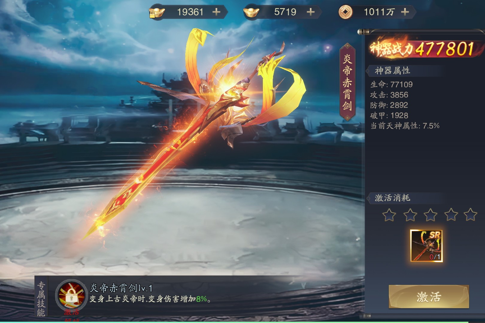 炎帝赤霄剑赤焰焚空金焰缠刃,蕴含着上古炎帝的焚天之力。激活后可获得77109生命、3856攻击、2892防御与1928破甲的极品属性,更能提升7.5%的天神属性,专属技能还能在变身上古炎帝时增加8%变身伤害。此剑一出,烈焰燎原,助你在仙途征战中如炎帝临世,无往不胜!