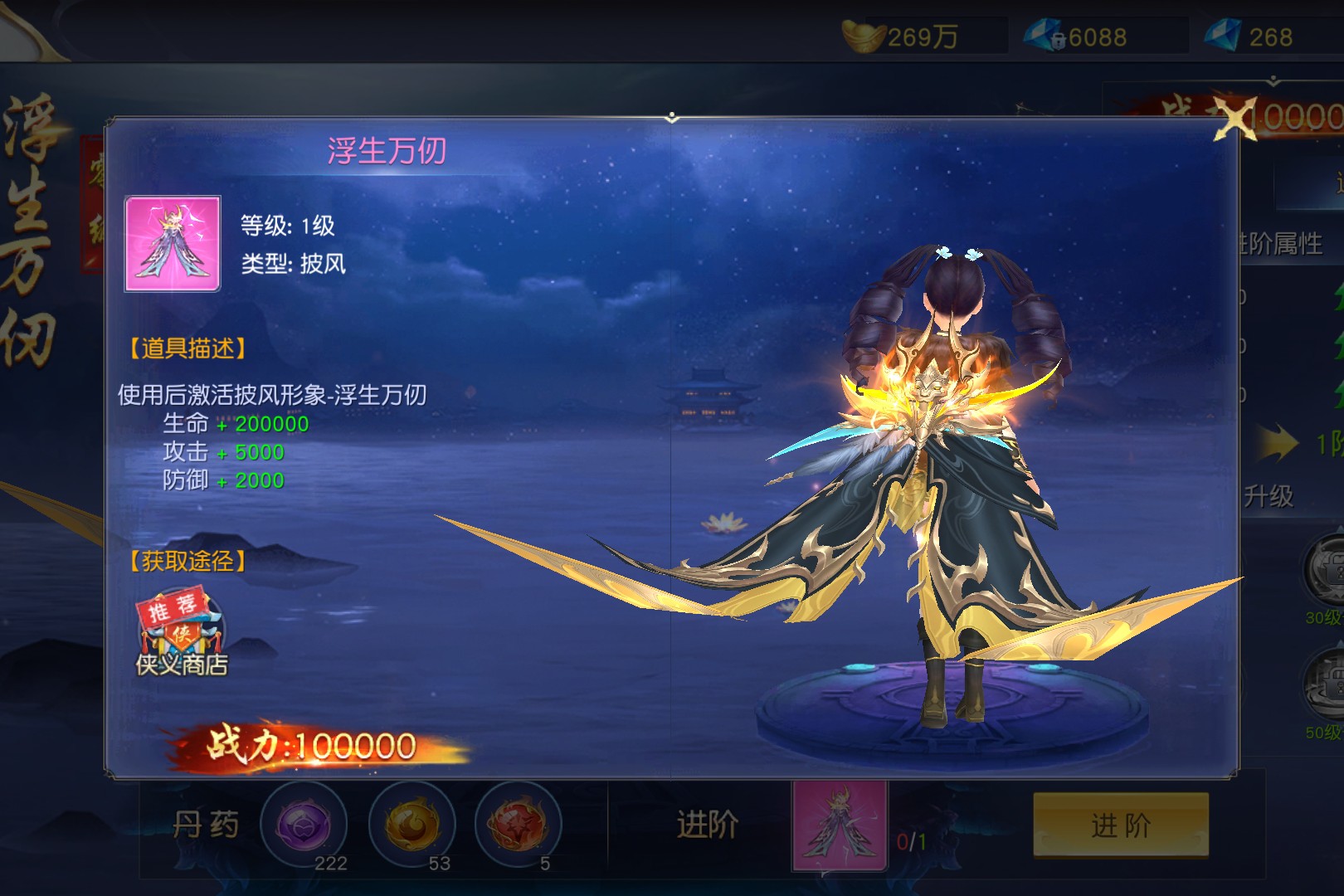 浮生万仞披风黑金缎面裹挟着锋锐金纹,如利刃裁风,尽显仙途霸气。使用后即可激活,不仅能提供200000点生命、5000点攻击、2000点防御的高额属性加成,更以其极具张力的造型成为仙域中独树一帜的存在。黑金交织,金刃流转,这款披风以深邃黑底搭配鎏金刃状饰纹,背后的光效与刃翼设计,行走间如携万仞锋芒,既显凌厉气场,又不失飘逸仙姿。无论是秘境探险还是仙域对决,它都能让你在人群中脱颖而出,成为三界瞩目的焦点。