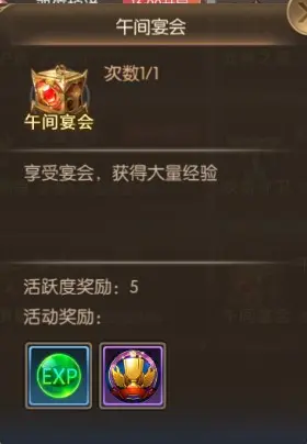 中午12点到点之后会在游戏界面副本上方出现午间宴会标识,午间宴会时间持续10分钟,按照游戏介绍进入可获得大量经验,那我带大家去探探真实。
