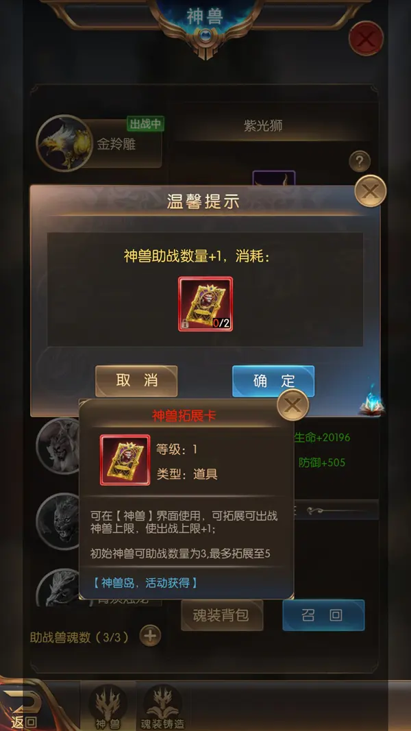 最后有个小tips,我曾经因为不断为已助战的神兽升级魂装,却没有留意到自己原来已经可以召唤更高级的神兽助战了,期间真的亏了不少啊。所以建议大家可以先把所有的魂装都卸下,然后看看自己是否可以召唤更高级的神兽进行助战,这样不会白白浪费掉挑战更高战力的boss的机会~