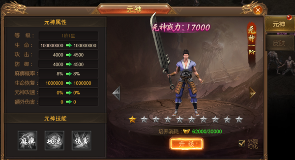 元神每升10星可进行升阶,升阶会提升元神的形象,同时提升元神攻击时的麻痹概率,概率越高,越容易让怪物无法动弹。