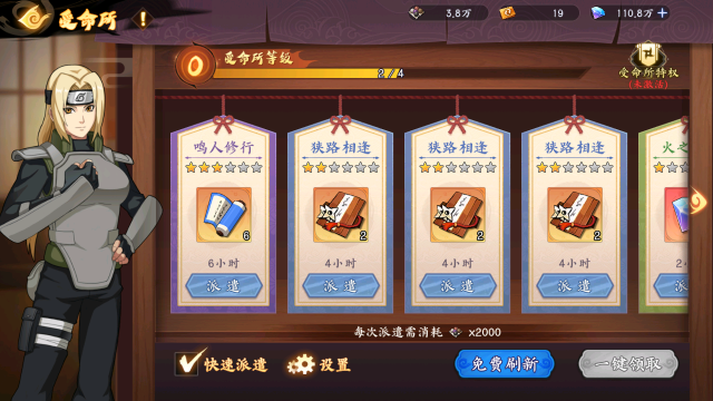 3、不同品质的受命所任务,需要派遣对应品阶和阵营的忍者,并消耗一定的五色军粮丸才能接取。